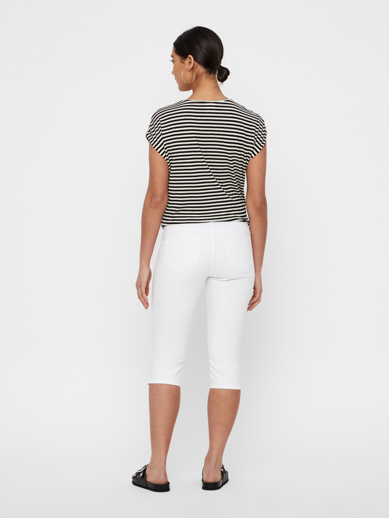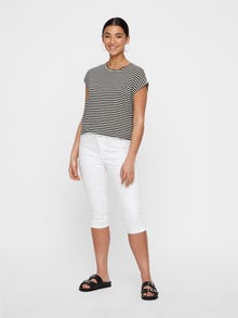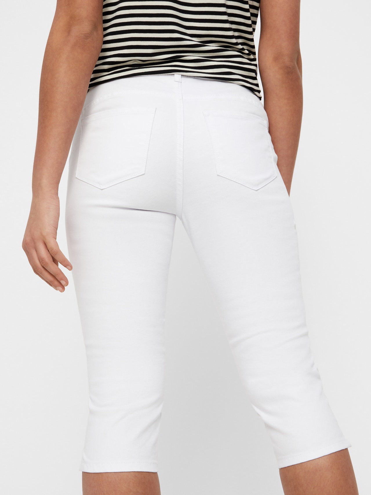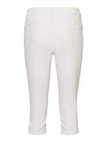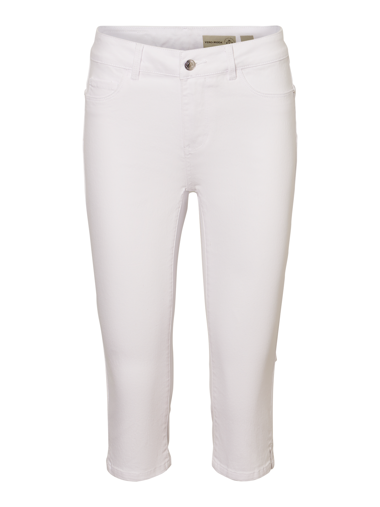 Et par hvide capri-jeans i slim fit med en mellemhøj talje. Bukserne har for- og baglommer, en slids forneden på benene og lukkes med knap og lynlås. De er lavet i et strækbart materiale, som sikrer en god komfort.
