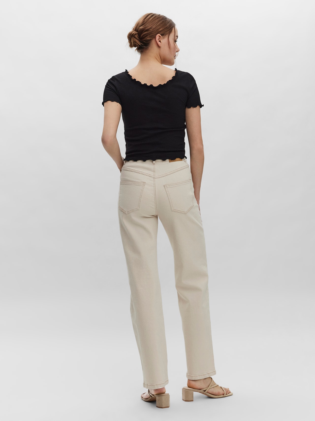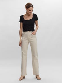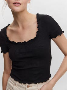 Top med flæsedetaljer, korte ærmer, en dyb u-halsudskæring og flæser ved halsudskæring, ærmekanter og nederste sømkant. Brug denne fine top med nogle højtaljede jeans og et par højhælede støvler for at få et cool og sofistikeret hverdagslook.