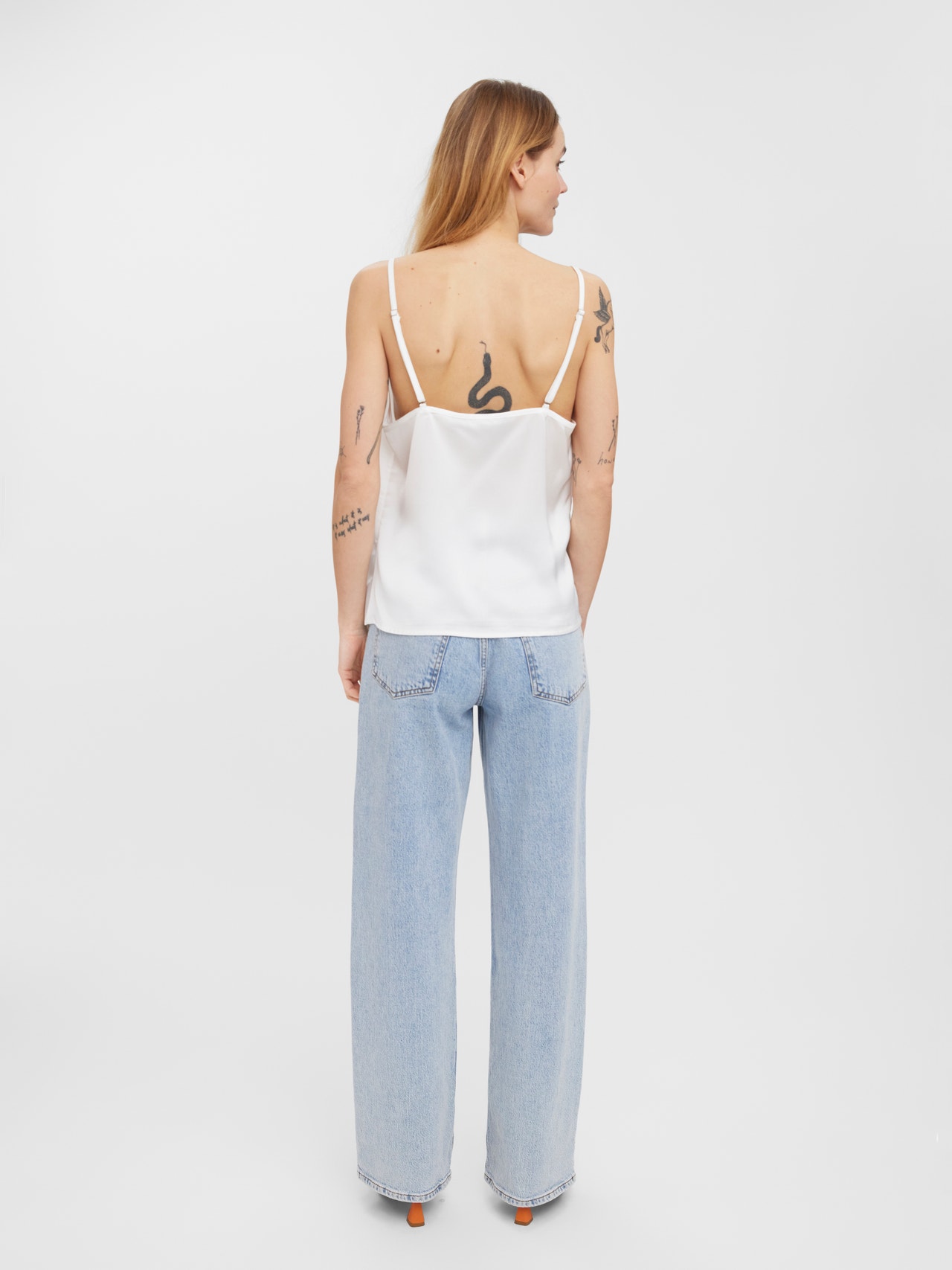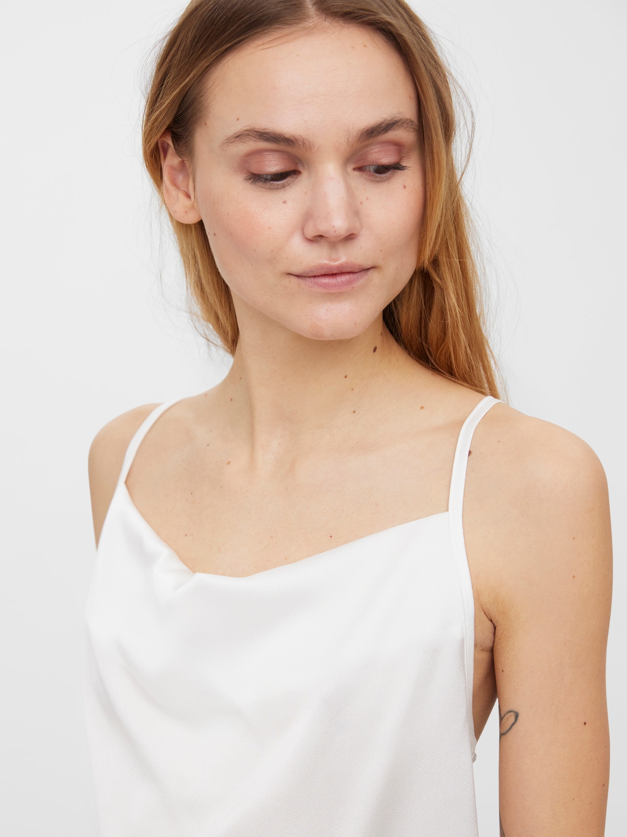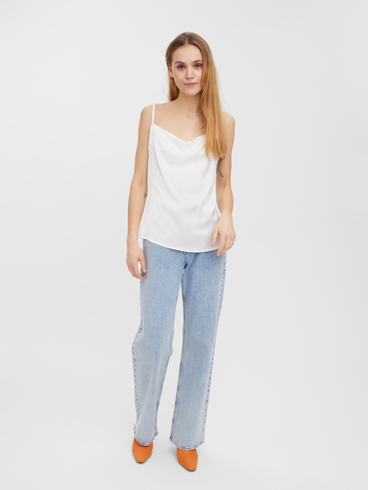 Singlet top with thin straps, a cowl neck, and adjustable straps. Style this gorgeous top with a pair og jeans and some heels for a stylish party look.