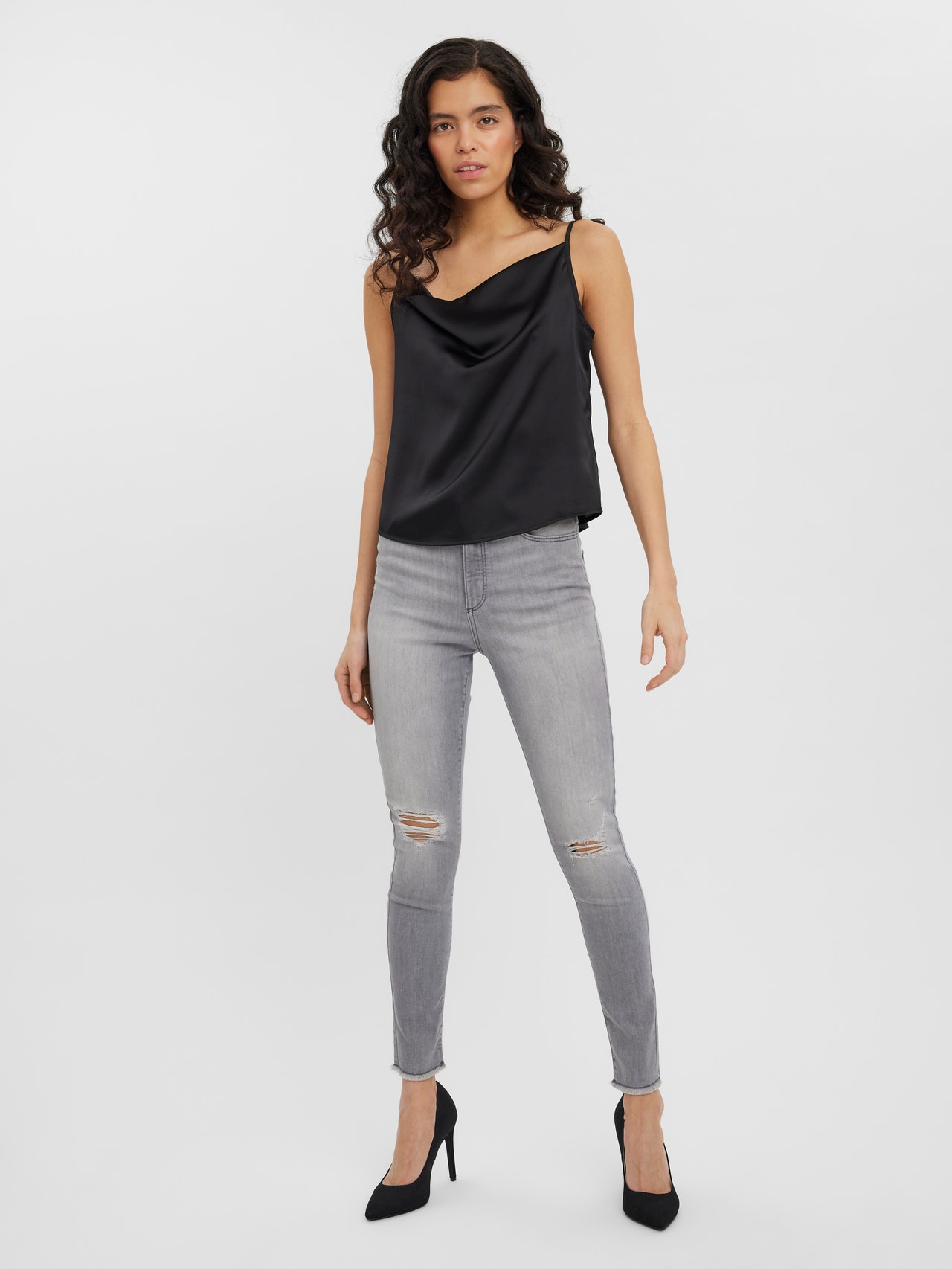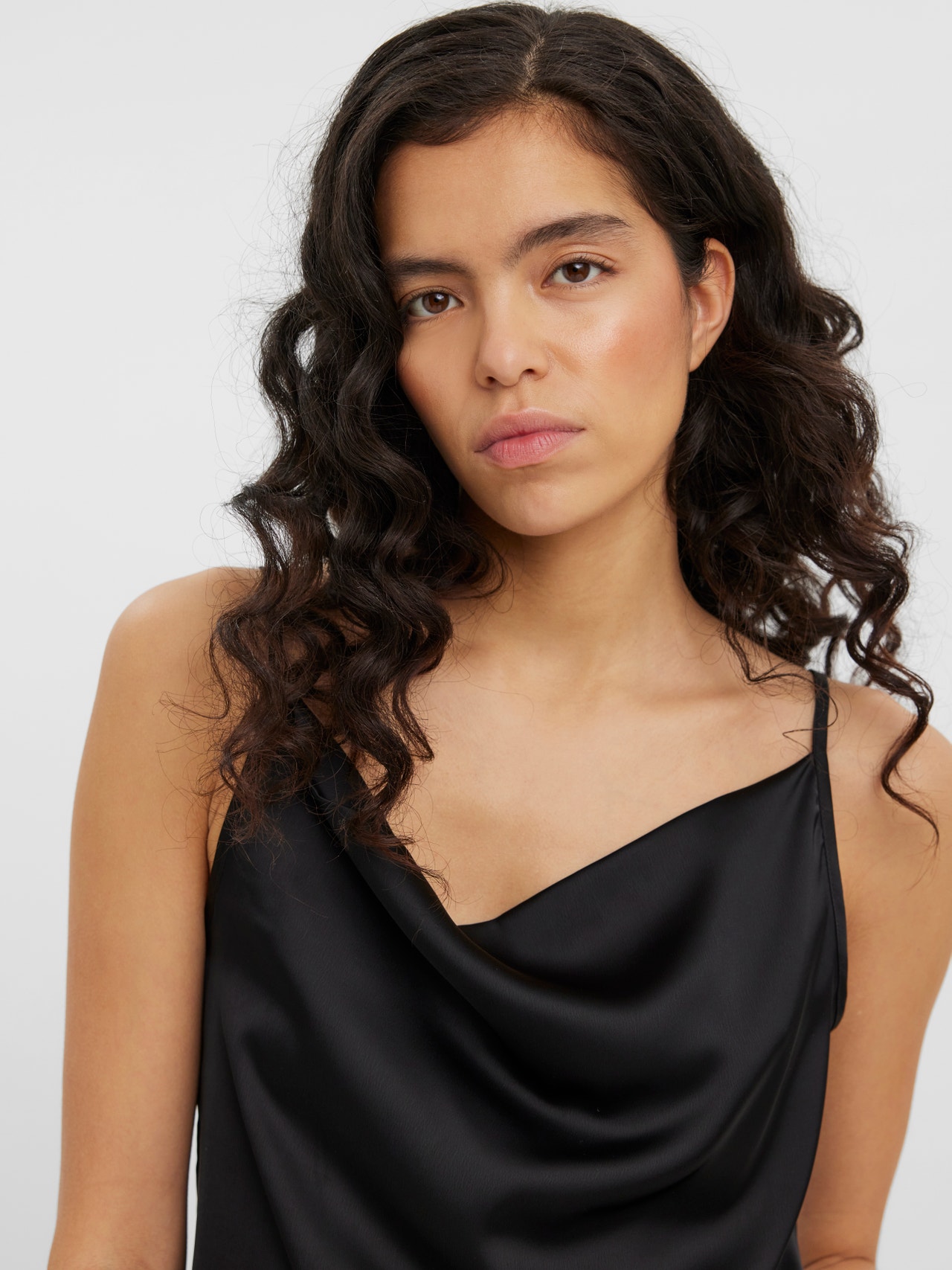 Satin top with a waterfall detail and adjustable straps in a regular fit. The perfect satin top to add to your party essentials. Style this stunning dress with a pair of heeled boots, a blazer, and your favourite straight trousers for a stylish look.