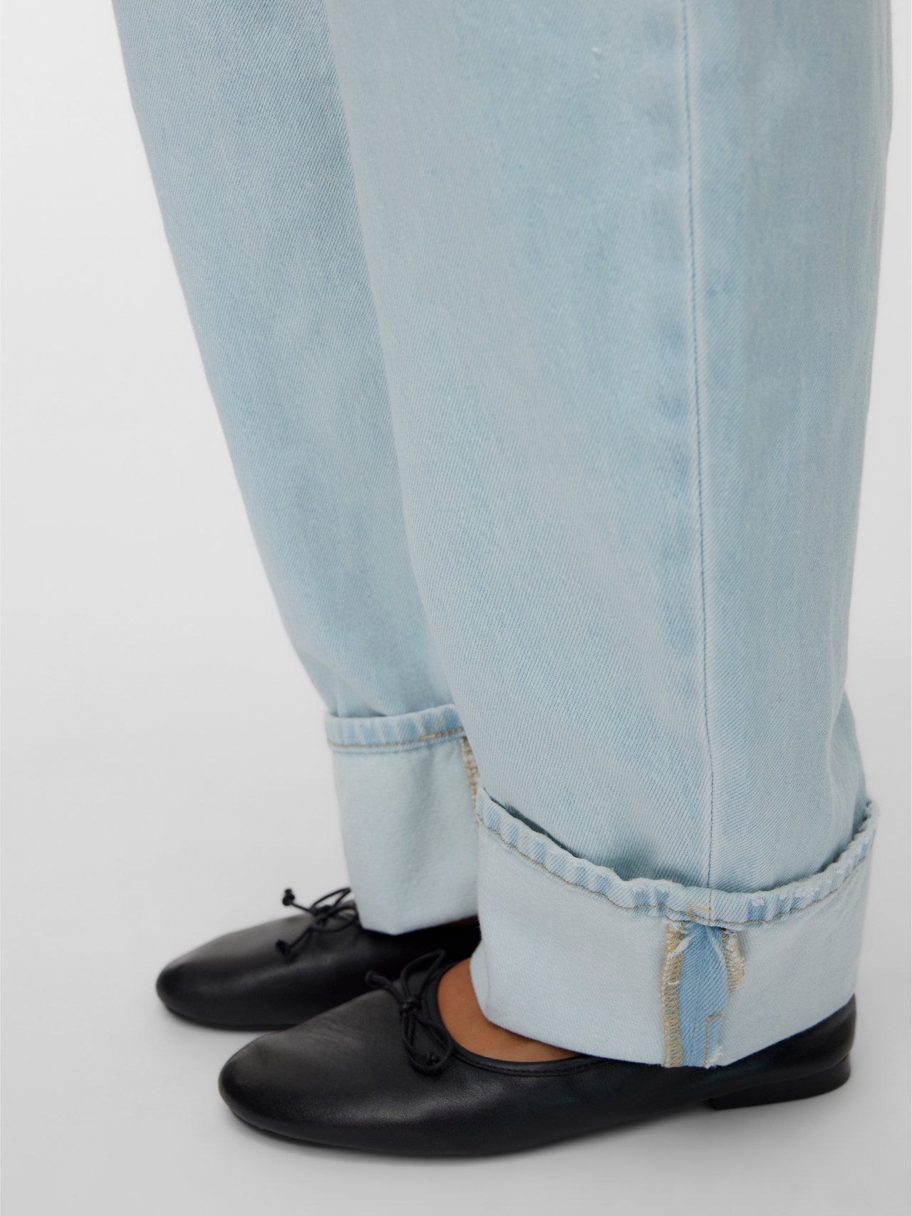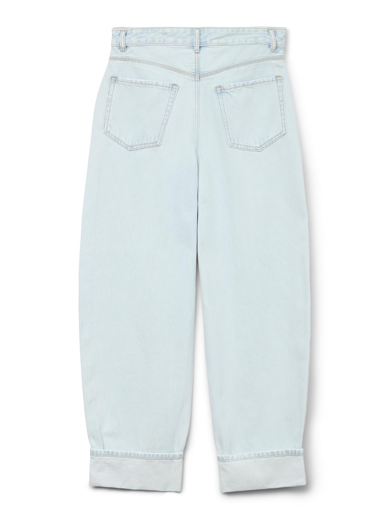 Lyseblå barrel fit jeans med høj talje. Disse jeans har en mom fit pasform og er detaljeret med opsmøg ved benafslutningen. De lukkes med knap og lynlås og har klassiske for- og baglommer.