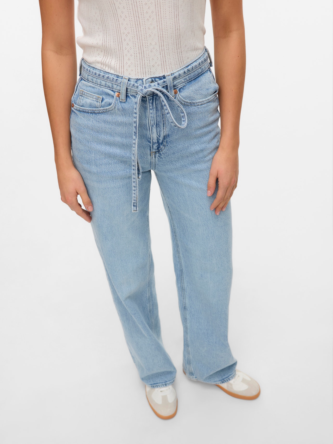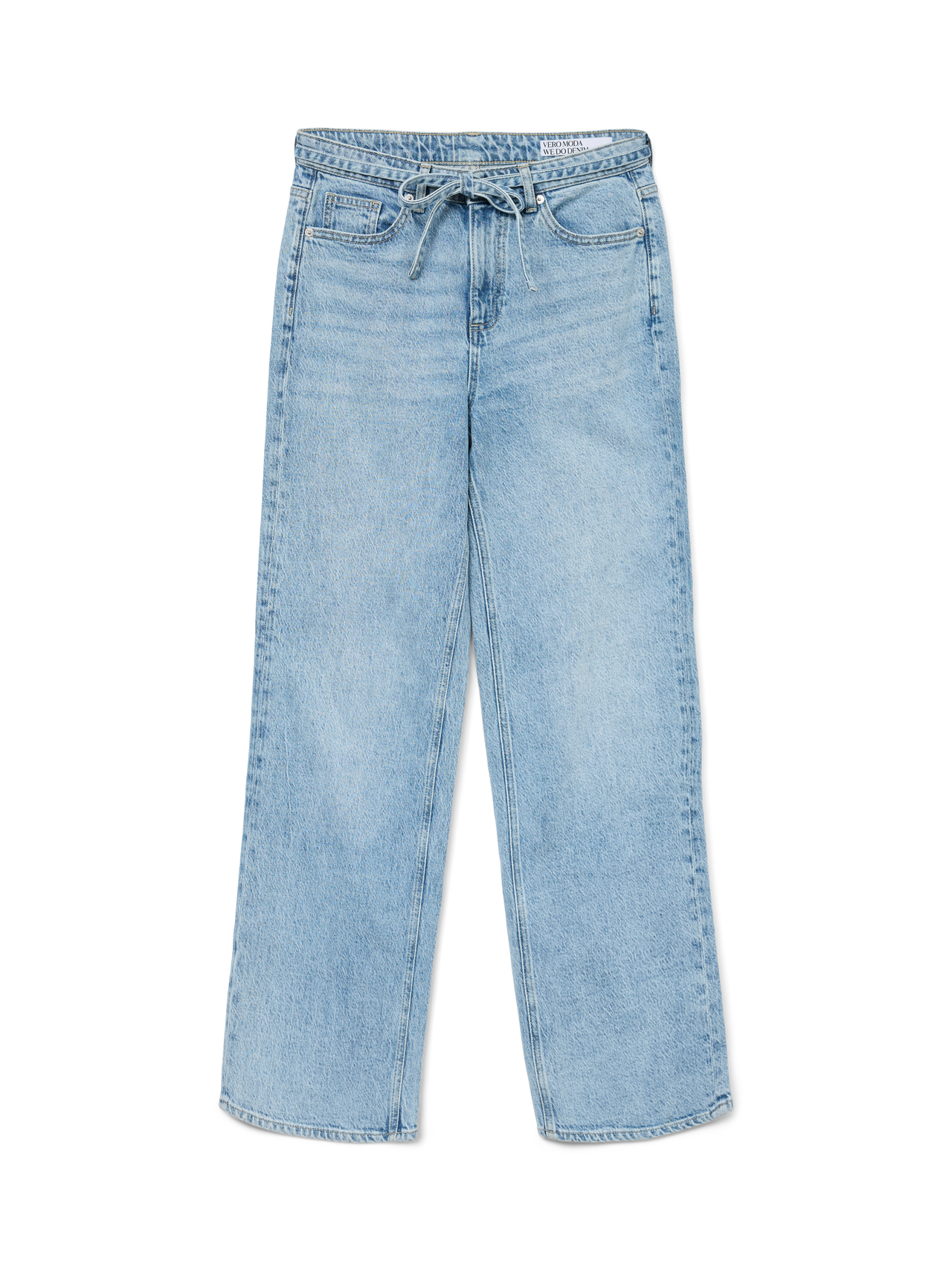 VMTESSA er et par high-rise jeans med wide leg fit. Disse jeans har en stone wash, der giver et vasket udseende, og er fremstillet med en smule elastan for strækbarhed. Designet inkluderer bæltestropper med et tilhørende bindebånd i taljen samt klassiske lommer foran og bagpå.