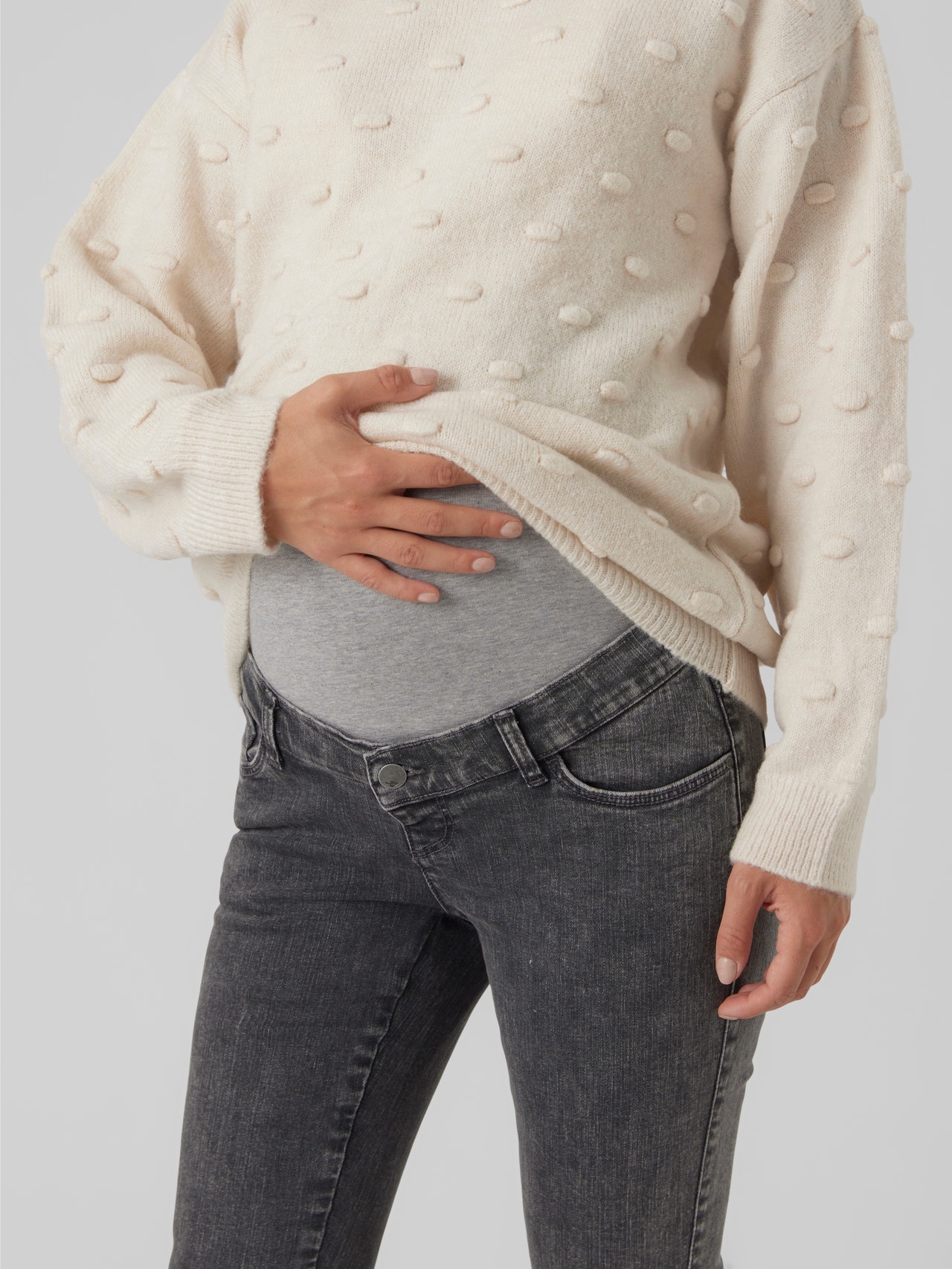 Vær sej i et par graviditetsjeans, der er designet til at passe til alle graviditetstrin og støtte din babybule med et elastisk babybule-bånd.