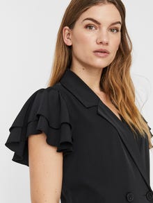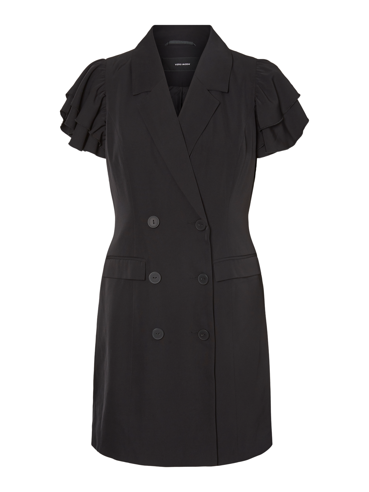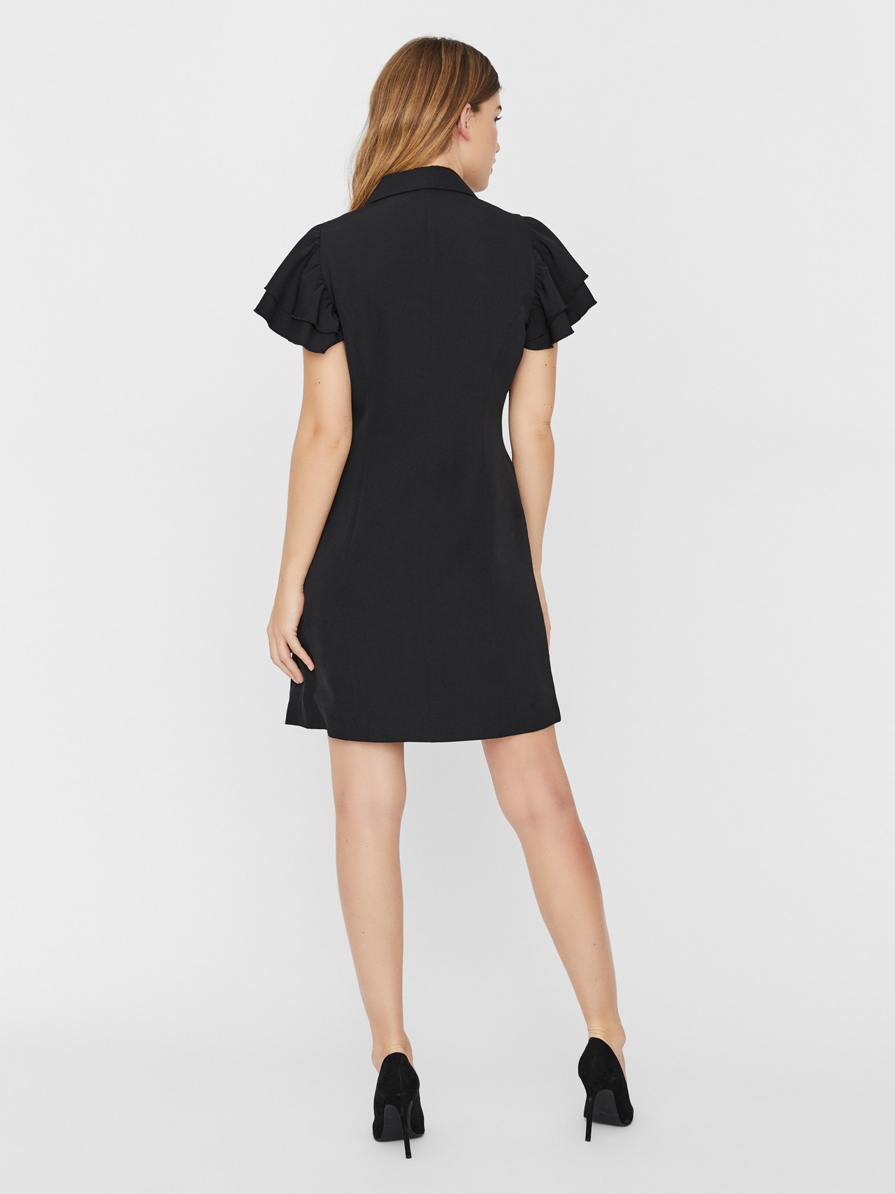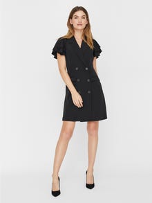 Blazer-inspired mini dress with double-breasted closure, front pockets and ruffles at the sleeves. Wear the dress with high heels for an elegant office-inspired look.