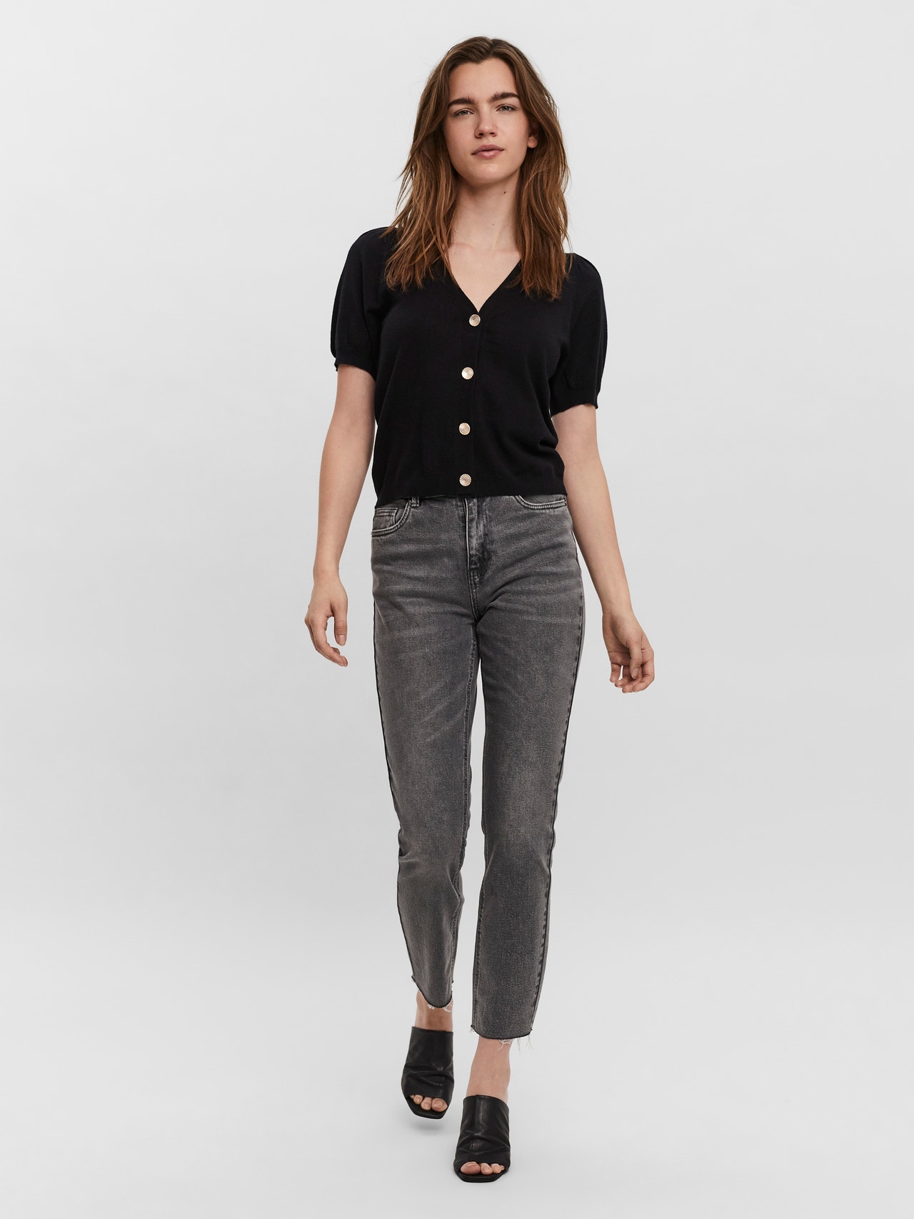 Cardigan with short volume sleeves and embellished button closure. The cardigan is made from a soft viscose blend material. Style it with trousers for an elegant look.