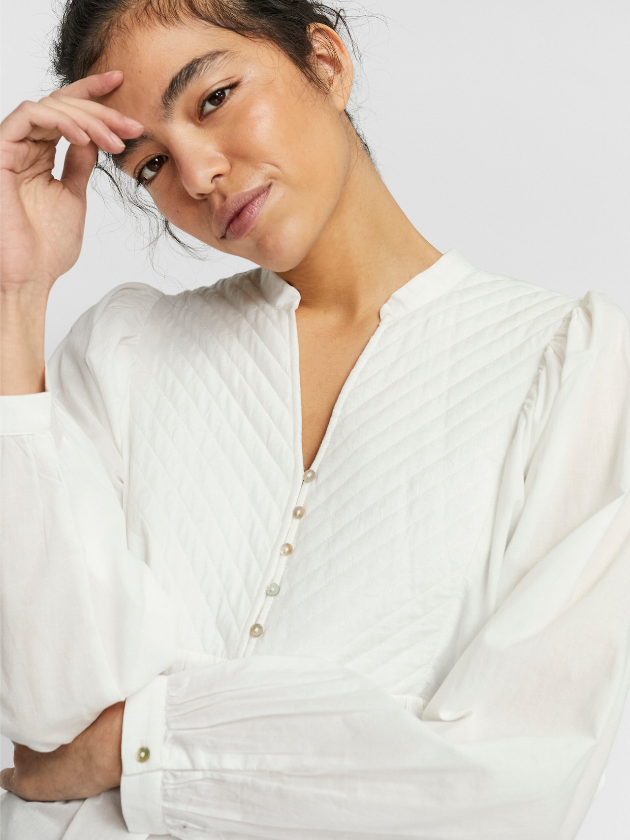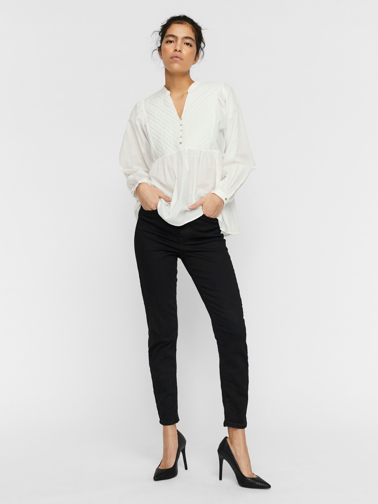 Long-sleeved top with diagonal stitching detail, balloon sleeves, and a cutline at the waist. Style this stunning top with a pair of skinny jeans and some heeled boots for a gorgeous look.