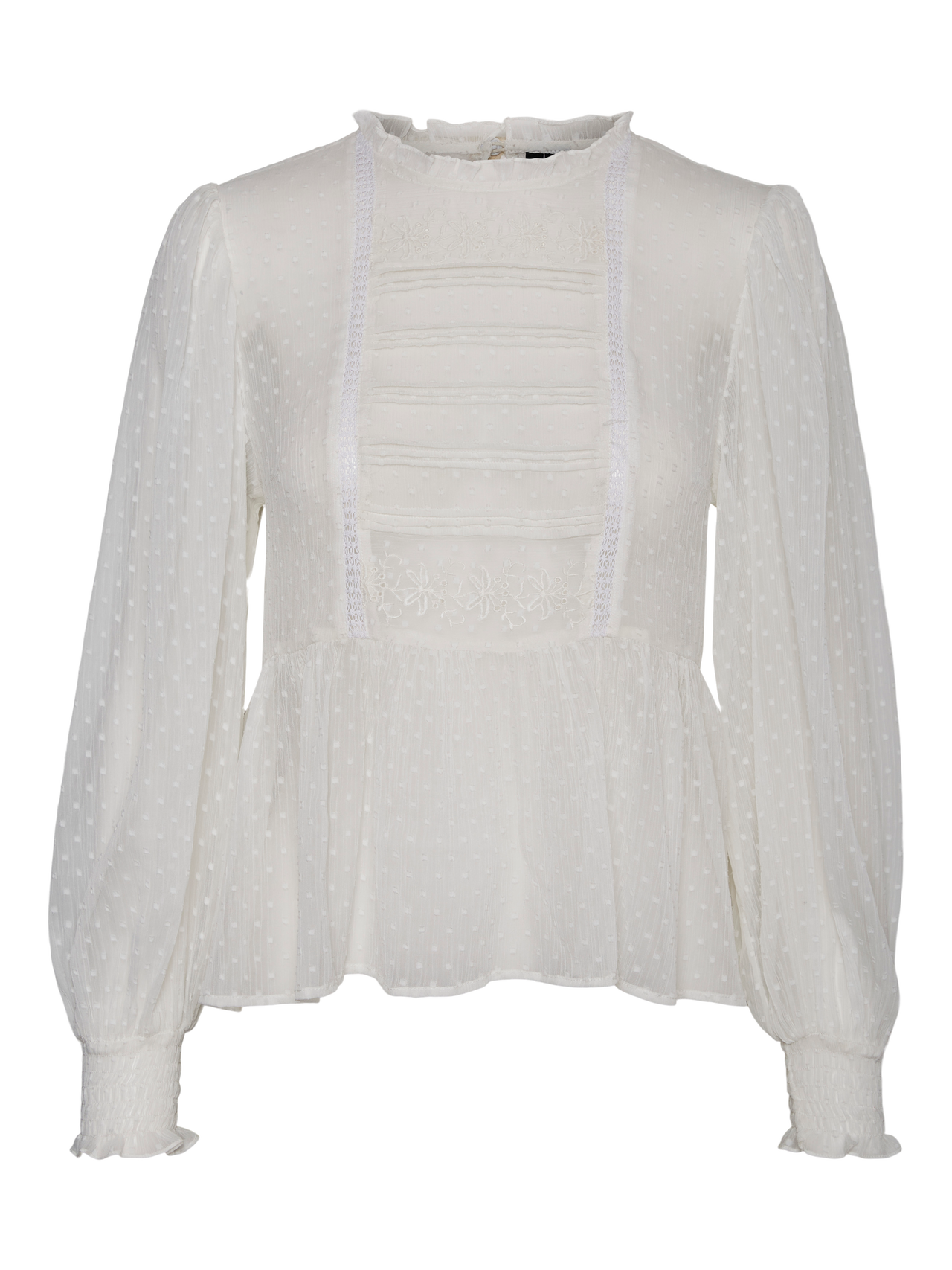Feminine blouse with smock at the cuffs, frills at the cuffs and neckline, a peplum effect, and volume sleeves. Style this beautiful blouse with some coated skinny jeans and a nice pair of heels for a cute and sophisticated occasion-look.