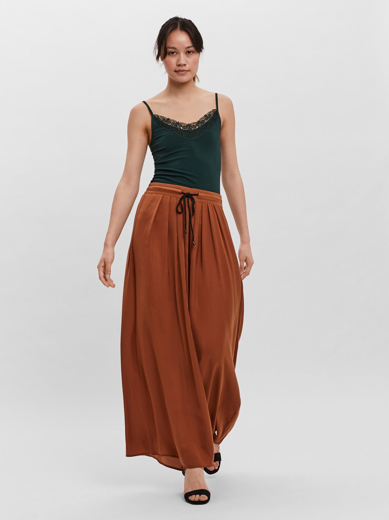 Extremely loose pants with tie strings, elastic waist, metal aglets, and wide leg openings. These comfy pants are perfect for a casual hangout at park, a walk on the beach that requires pants, or even a casual dinner event. Style them with a simple top and some subtle sandals for a great look.