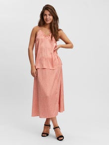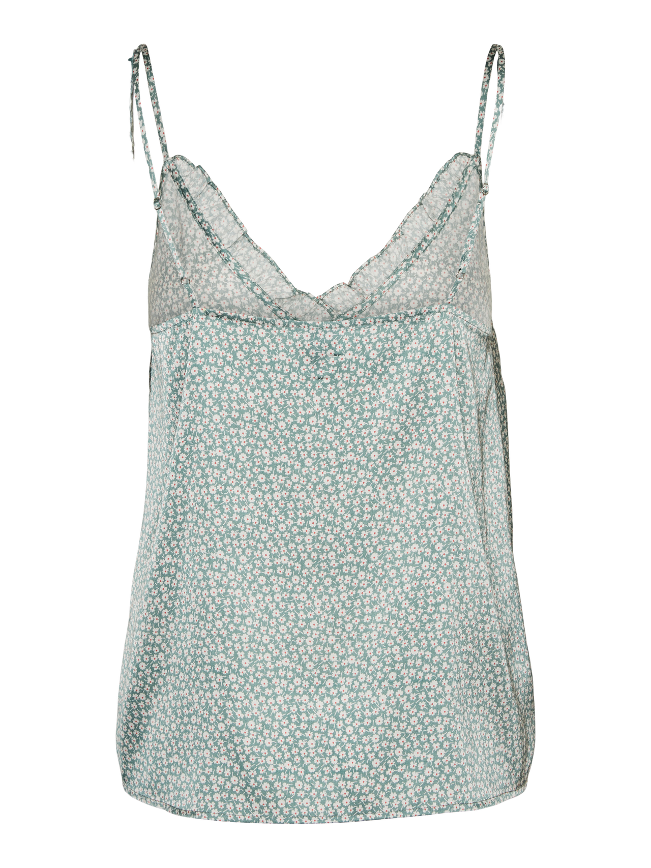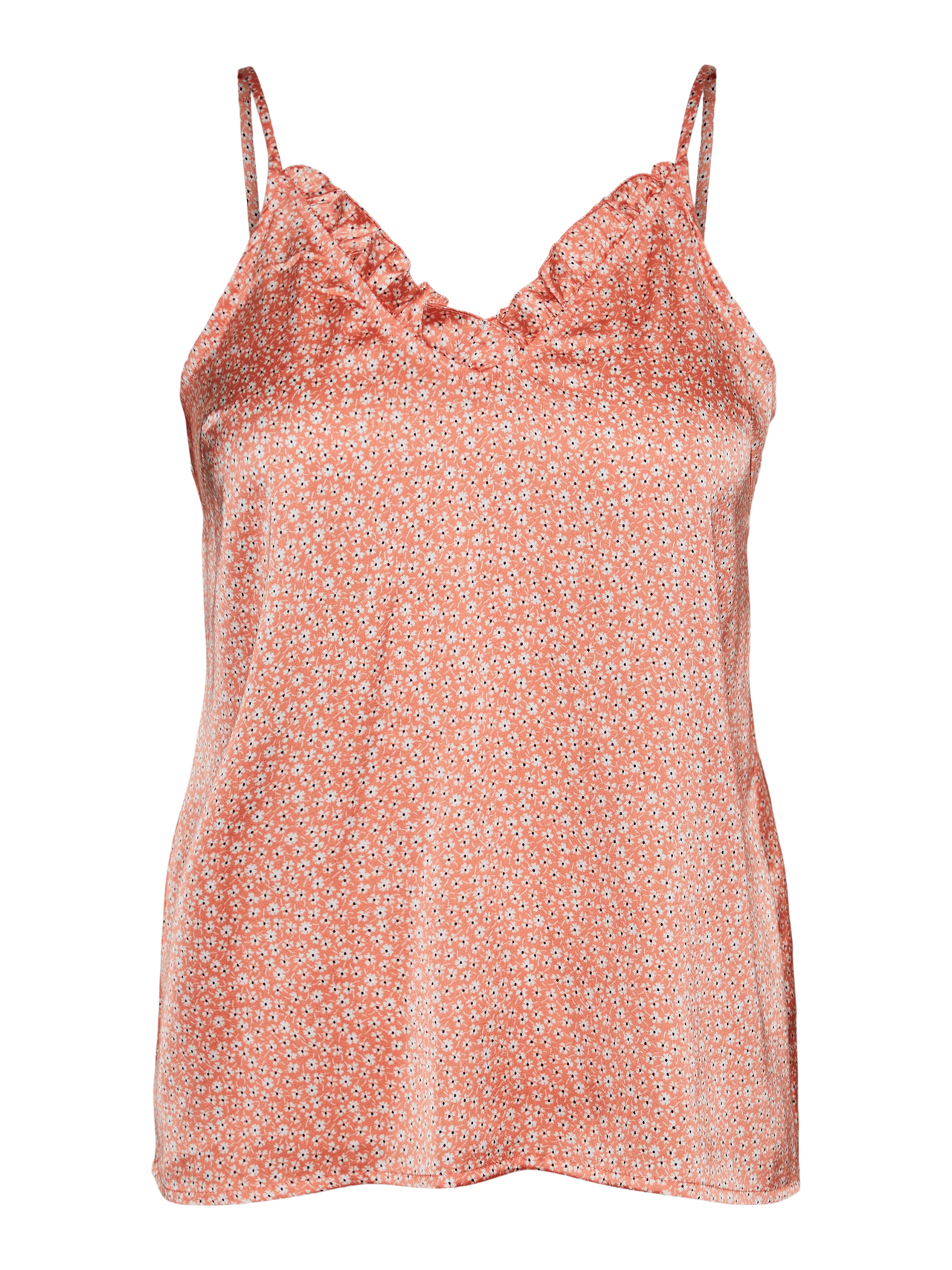 Satin top with thin, adjustable straps, a v-neckline with frills. The top has a beautiful satin look which adds some classiness to any look that this top may contribute to. Style it with some loose fitted trousers and a nice pair of heeled sandals for a sophisticated and cute everyday look.