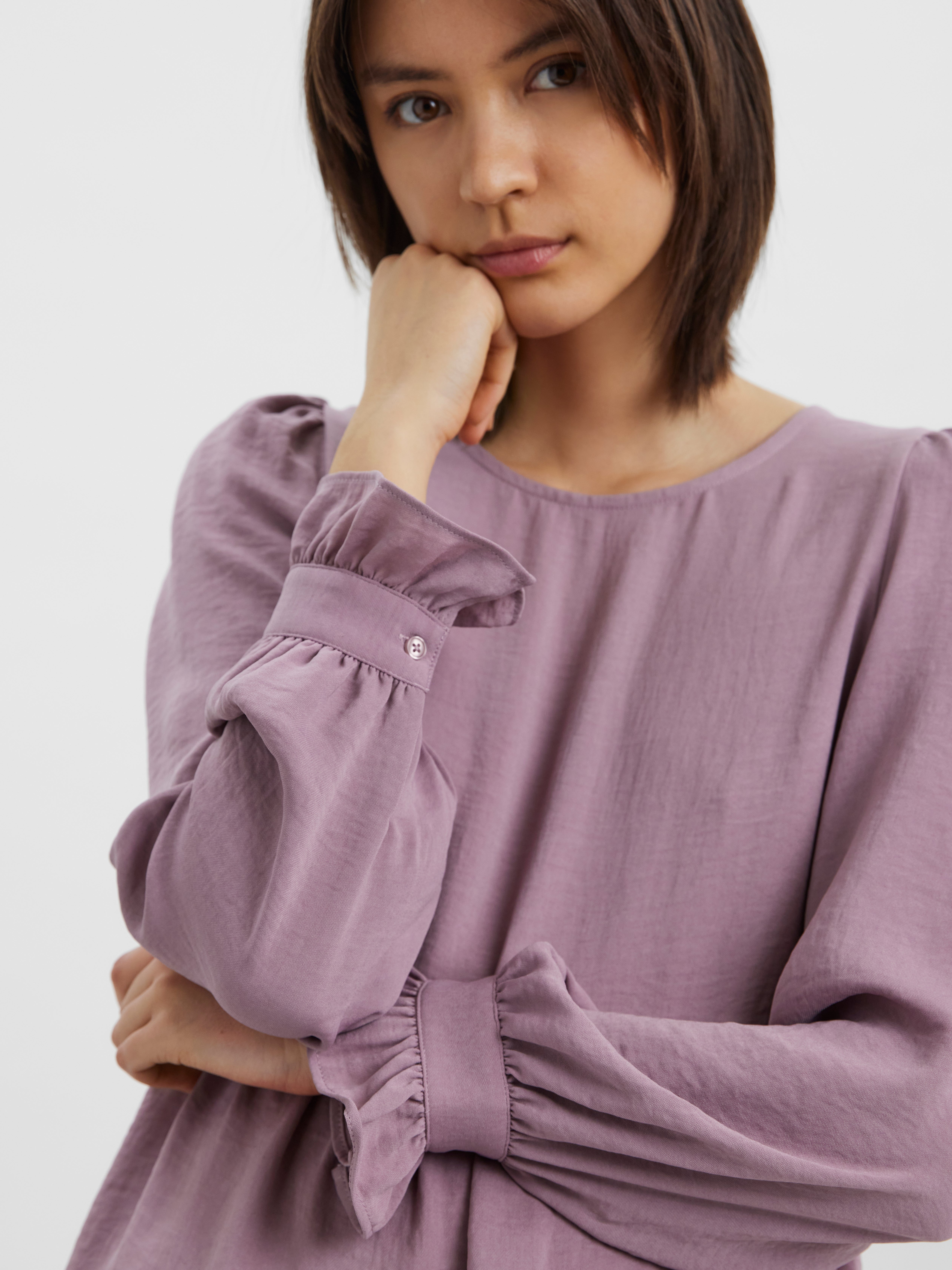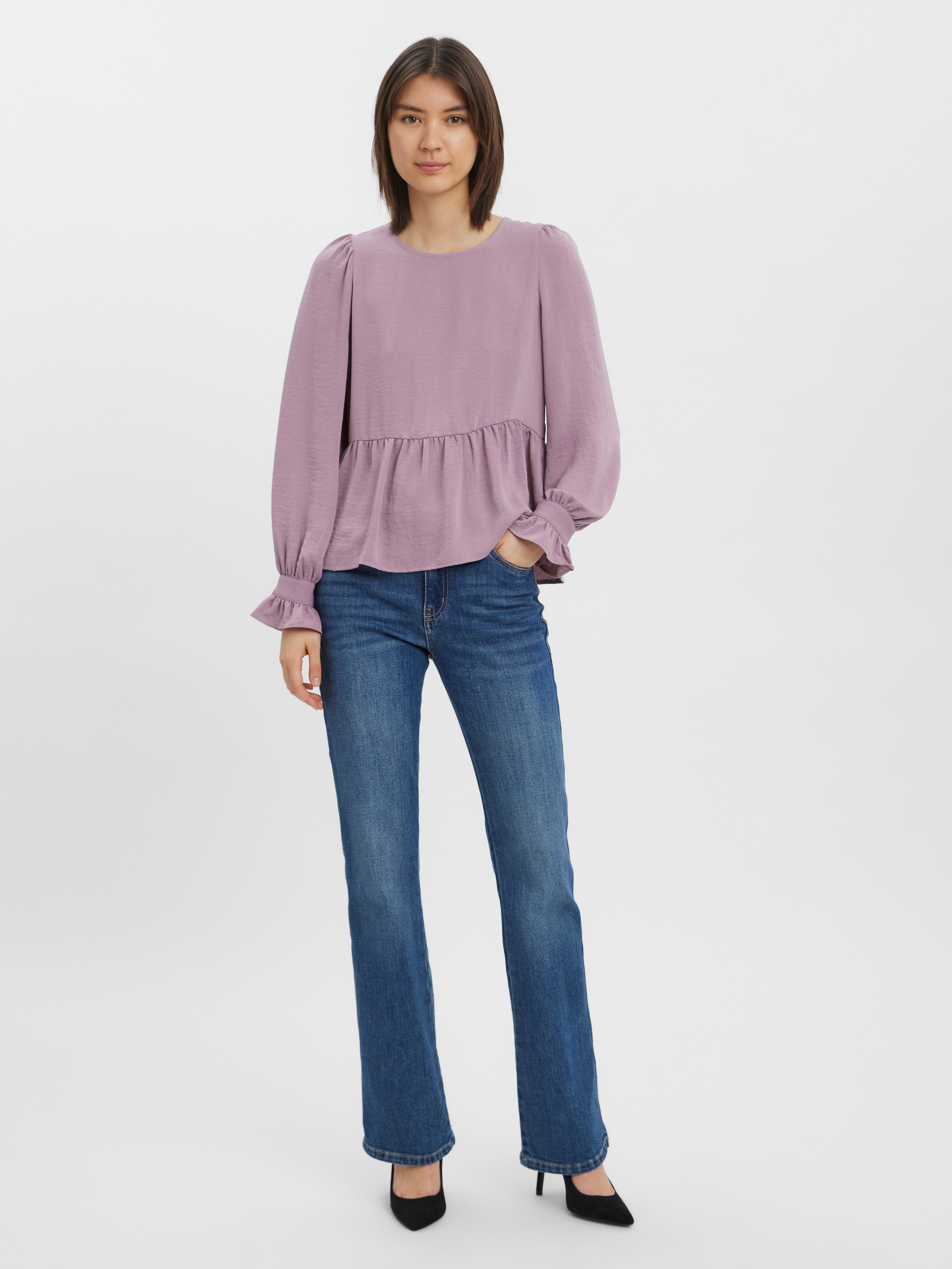 Langarmoberteil mit Schößchen, Rüschen an den Ärmelbündchen, Rundhalsausschnitt und Puffeffekt an den Schultern. Style dieses süße Oberteil mit einer Slim Fit Hose und Absatzstiefeln zu einem schicken Look.