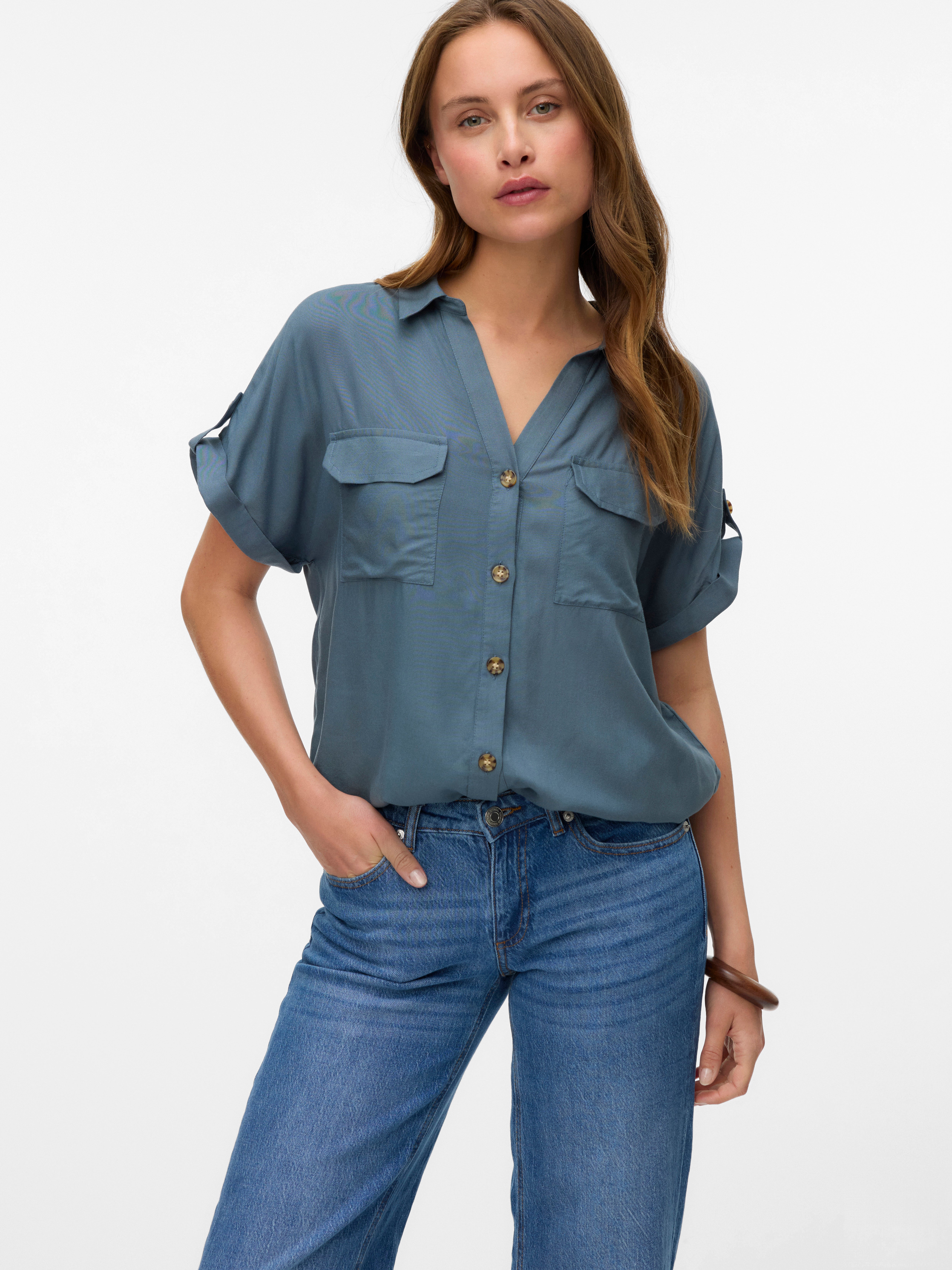 Diese Bluse ist ein schicker und vielseitiger Neuzugang in deinem Kleiderschrank, denn du kannst sie entweder offen über einem schlichten Oberteil oder geschlossen tragen. Kombiniere sie mit einer klassischen Jeans und einem schlichten T-Shirt zu einem coolen Alltagslook oder style sie schicker, indem du dazu eine Anzughose und Absatzschuhe trägst.