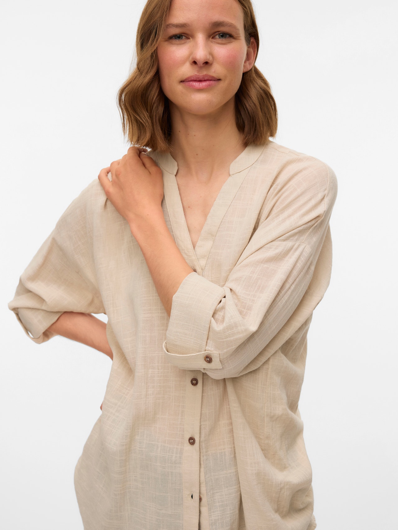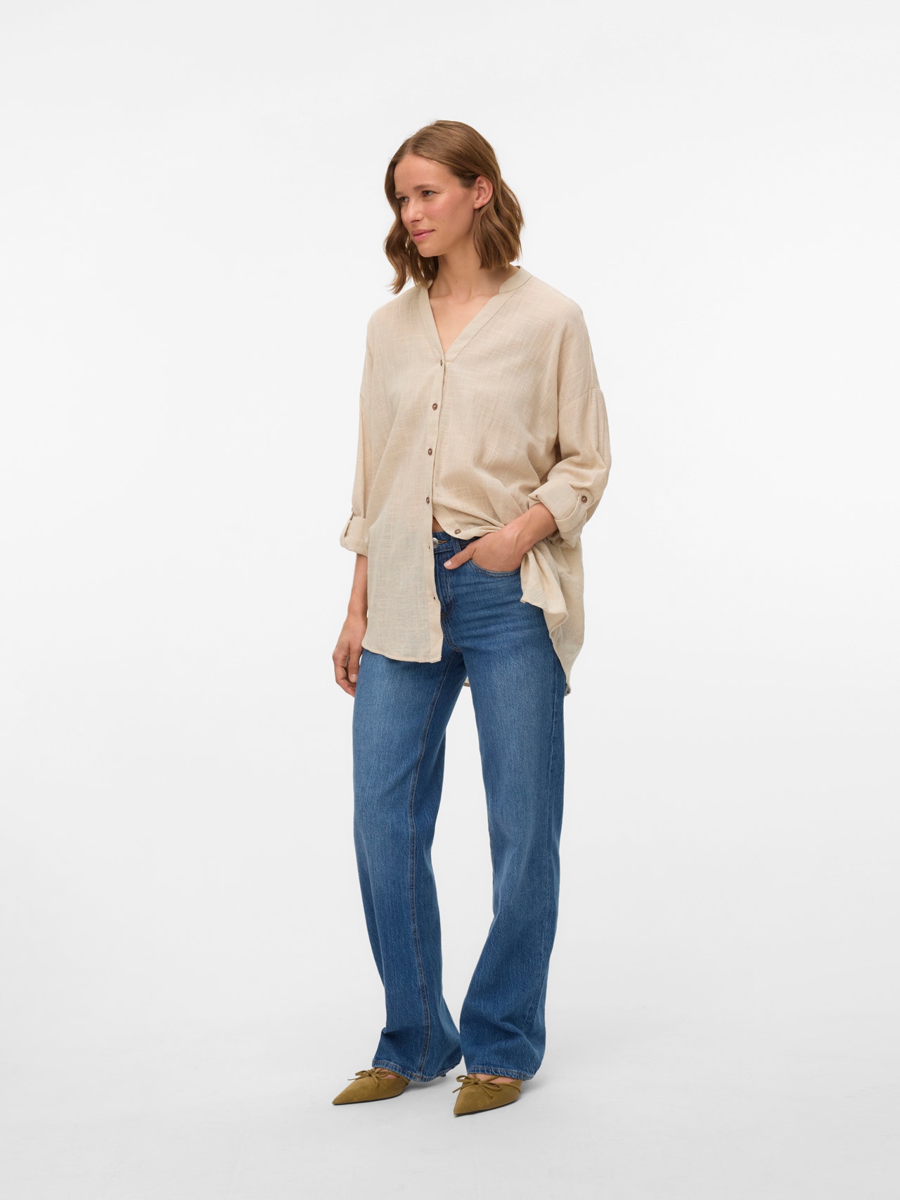 Basics finden sich in jedem Kleiderschrank. Unsere Basic-Oberteile sind das verbindende Element für ein Outfit – und dieses Oberteil ist da keine Ausnahme. Style es mit einer Hemdjacke, einer bequemen Mom Jeans und Chunky Stiefeln zu einem lässigen und coolen Alltagslook.