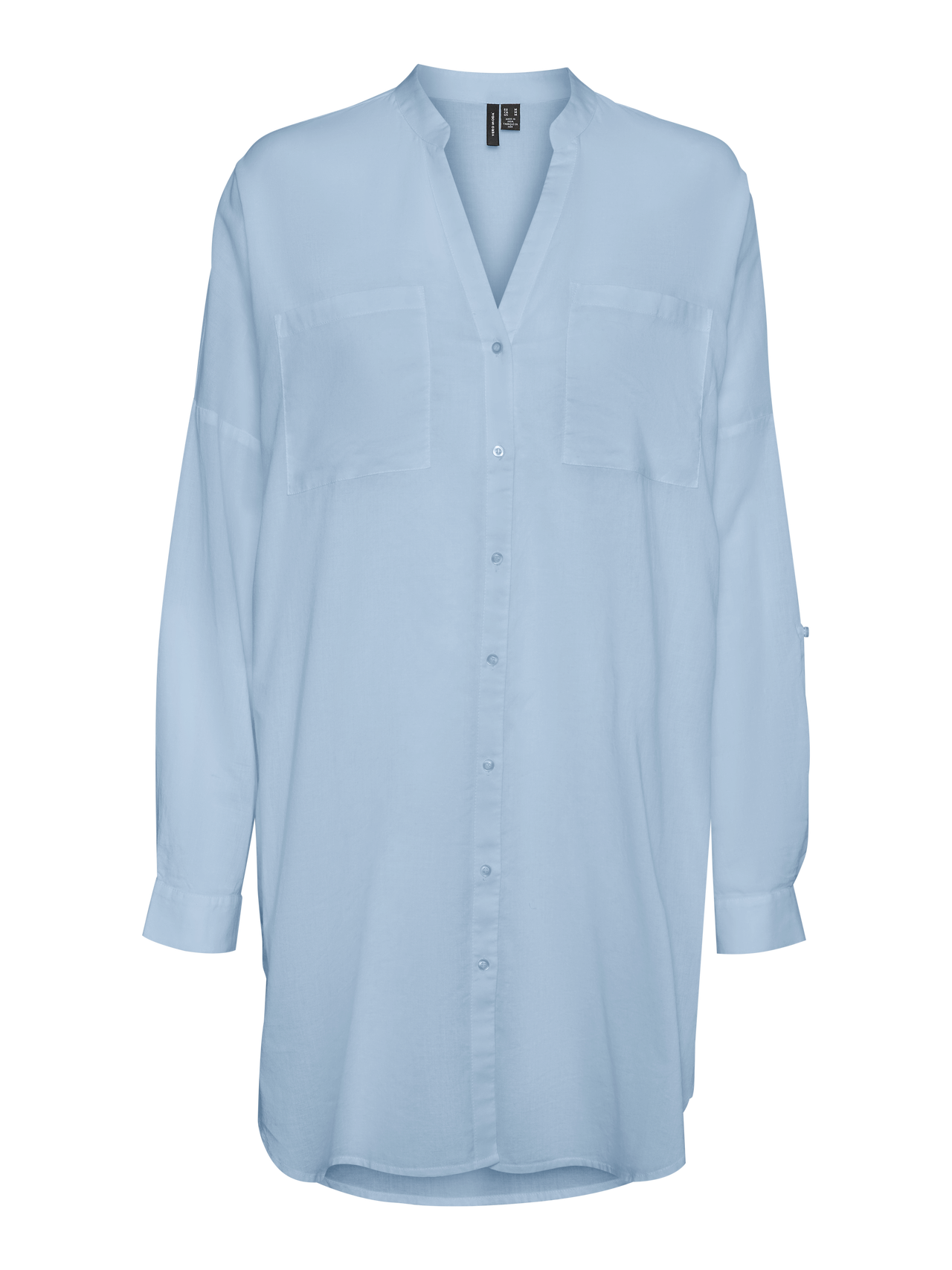Long shirt with a V-neck, breast pockets, and turn up details at the cuffs. The shirt looks perfect with a pair of skinny jeans and some boots.