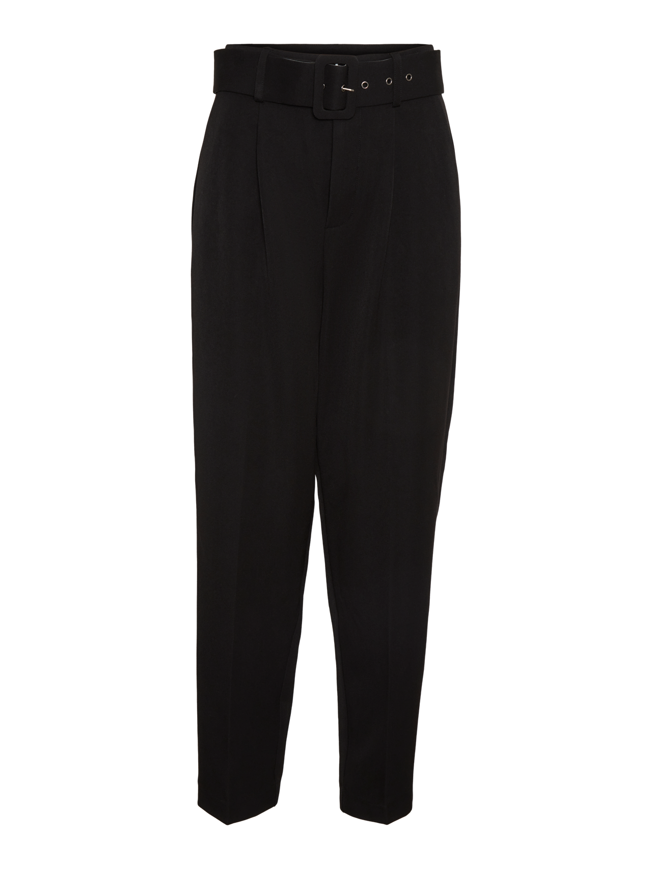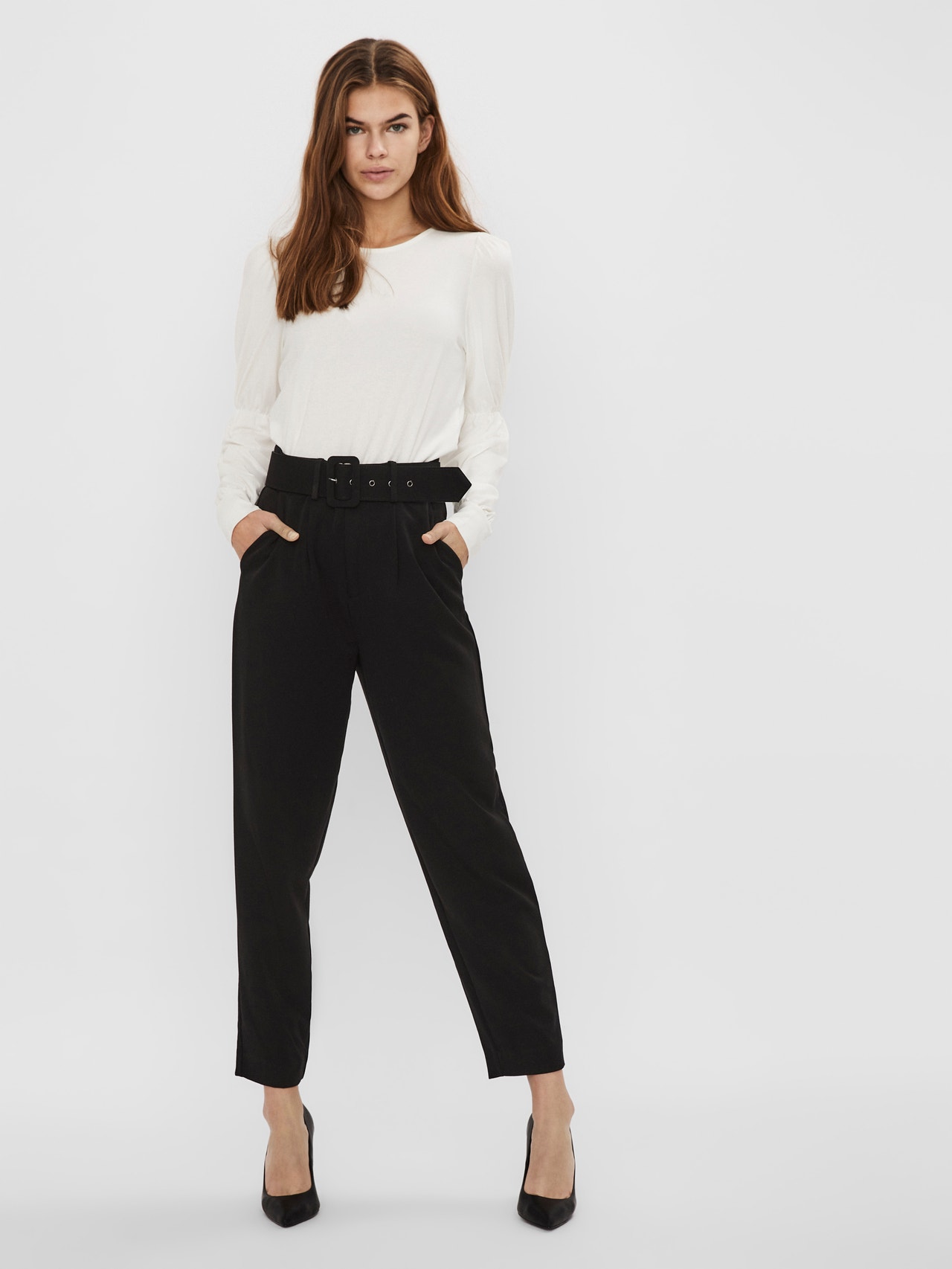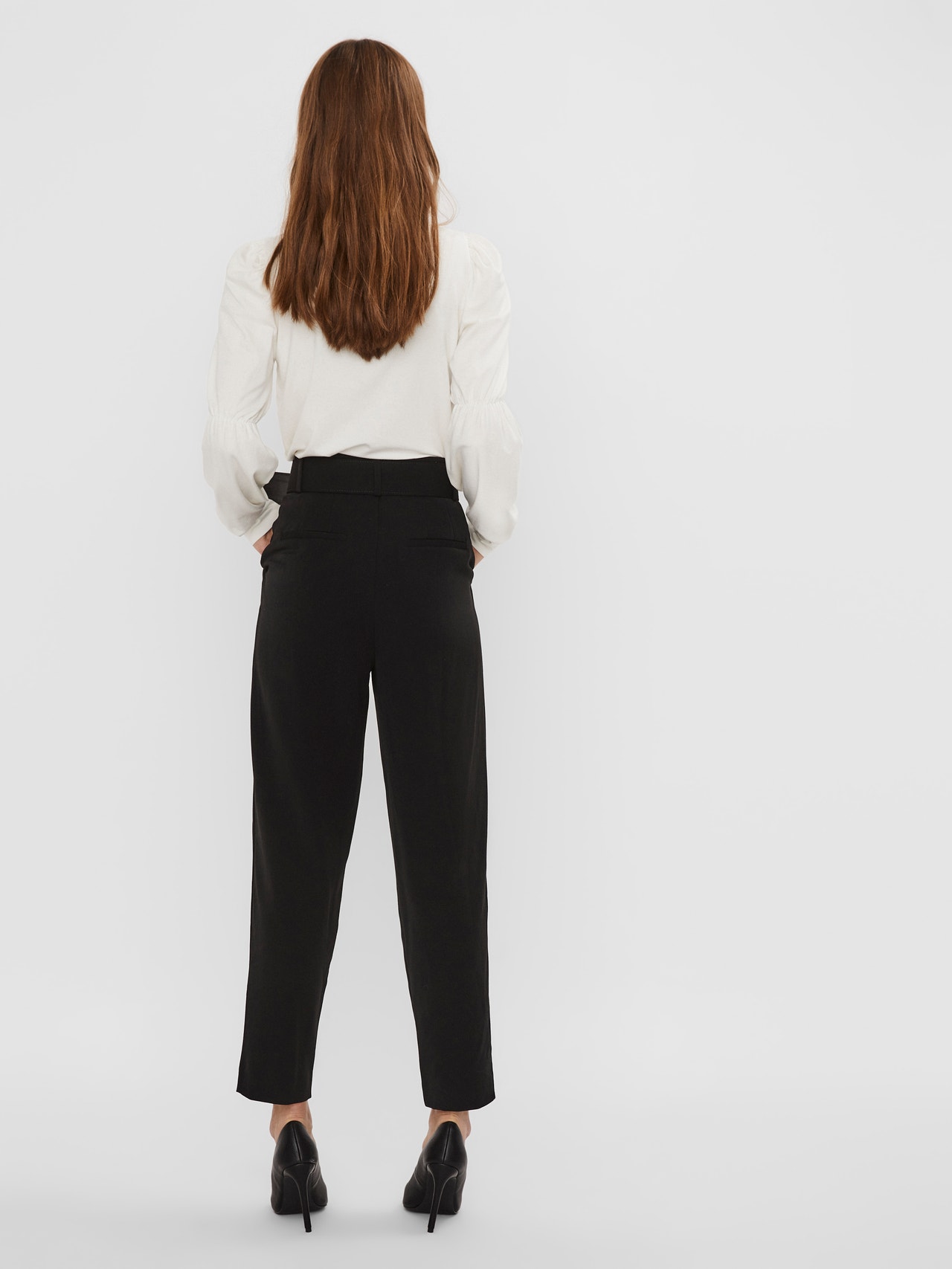 Tailored trousers with a buckle belt at the waist and false pockets in the back. The trousers are made from a soft viscose blend material. Wear them with a light knitted pullover.