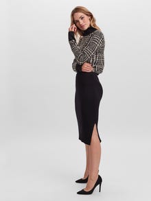 Knitted skirt with a ribbed structure, slit at one side, and elastic waistband in a midi length. Style this cool skirt with an oversized shirt and a pair of long boots for a simple, effortless look.