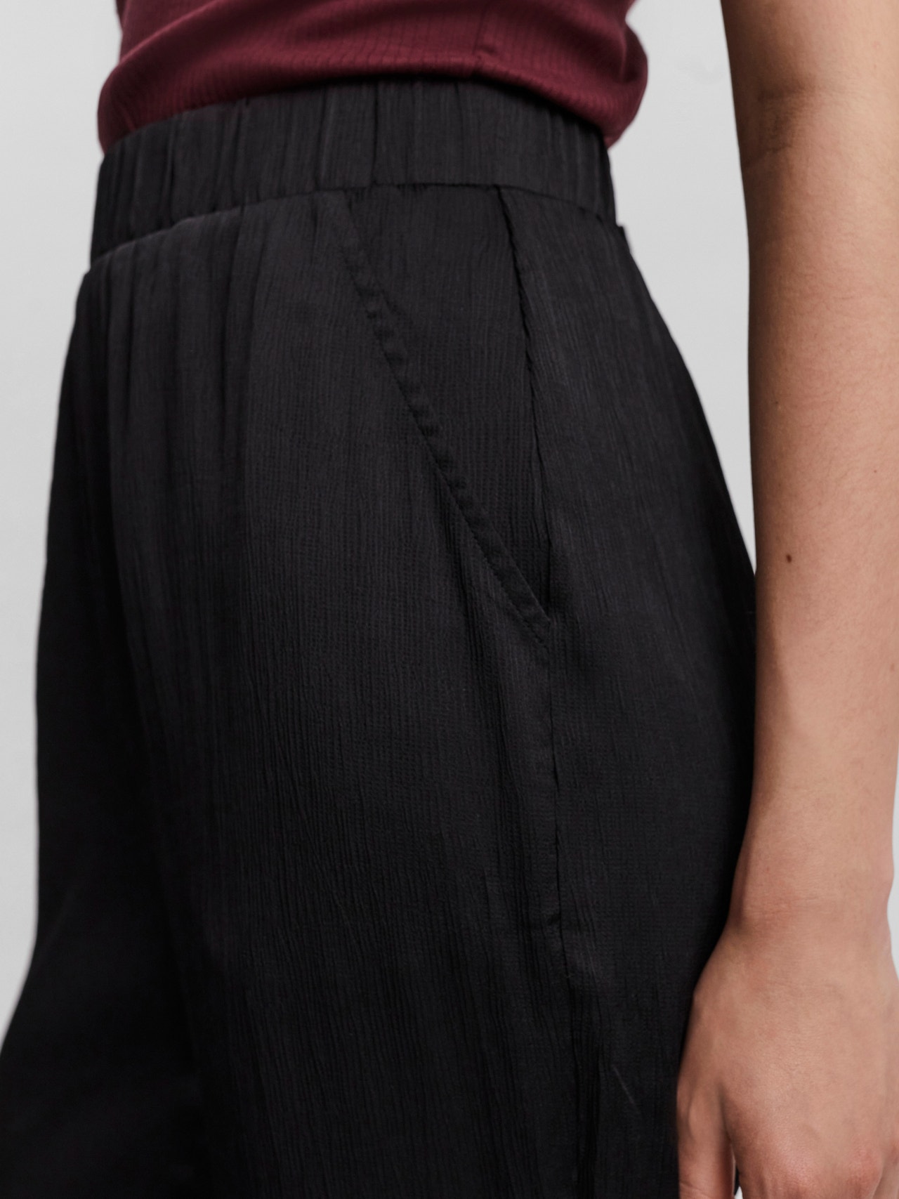 Loose pants with a high waist, side pockets, and an elastic waistline. Style these comfortable pants with a nice crop top, an oversized blazer, and your favourite heels for a sophisticated occasion look.
