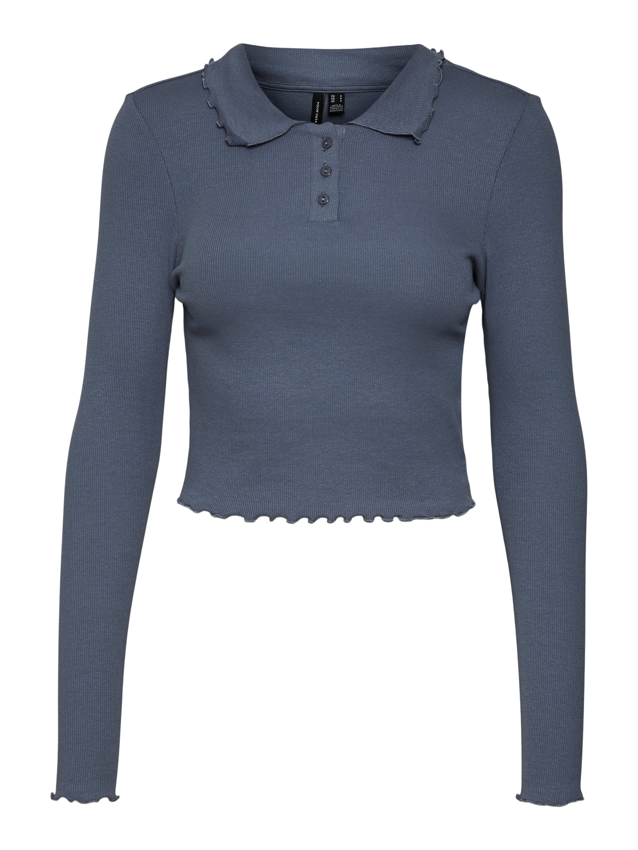 Long-sleeved top with a shirt collar and a baby lock detail at the cuffs, collar, and bottom hem in a ribbed structure. Style this cute top with a pair of wide leg jeans and some heeled boots for a classy, chic look.