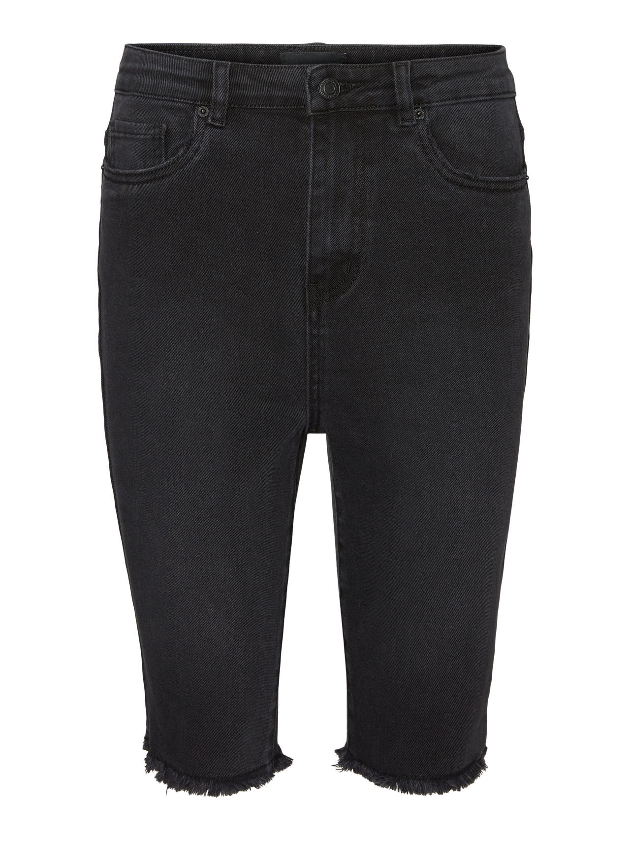 Long, denim shorts with a high-rise cut, a slim fit, button and zipper closure, and raw hems at the leg openings. Style these great shorts with some heeled sandals and an oversize shirt for a great everyday look.