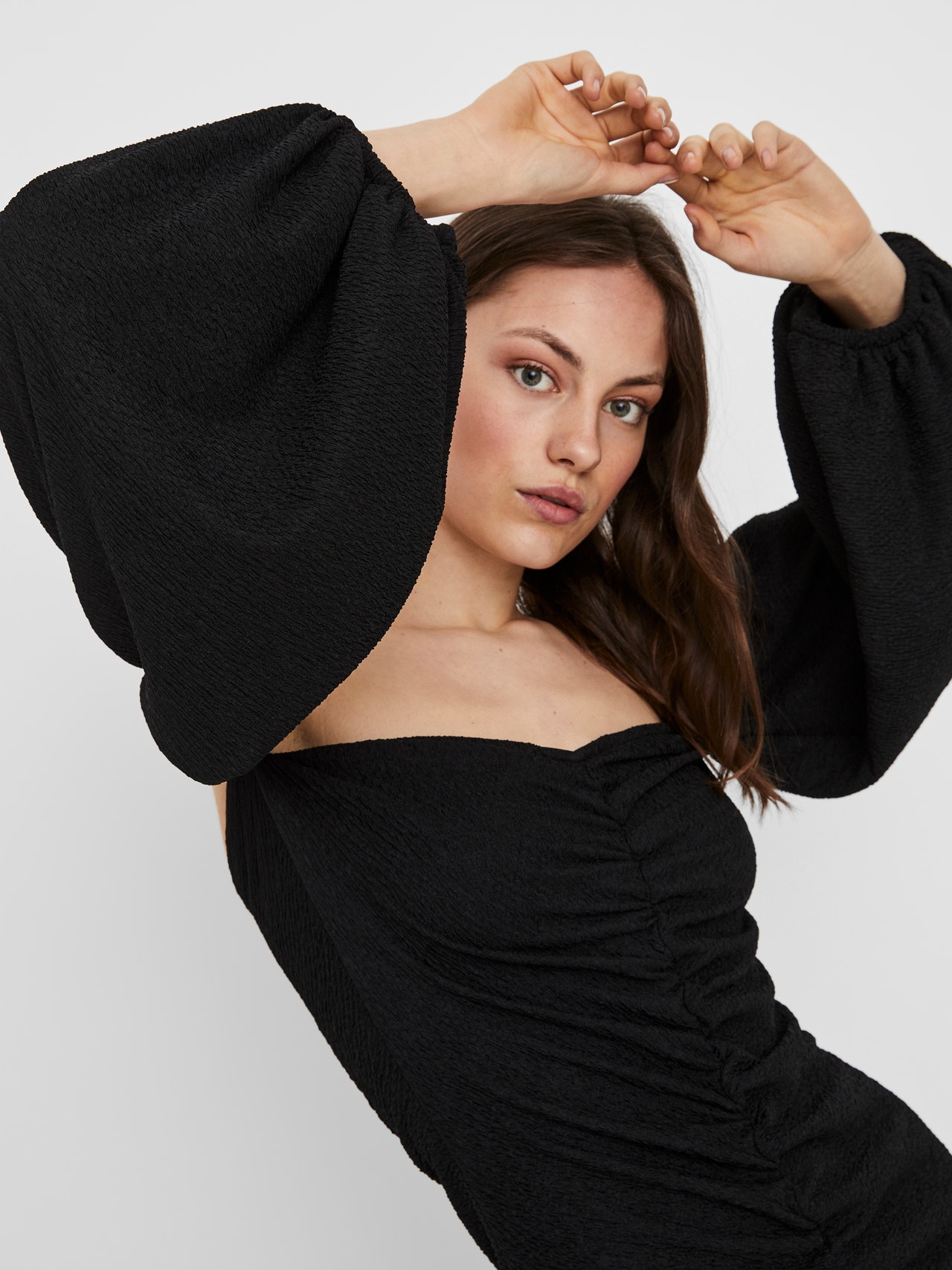 Off shoulder mini dress with sweetheart neckline, ruched details and voluminous sleeves. The dress looks perfect with your favourite pair of high heels.