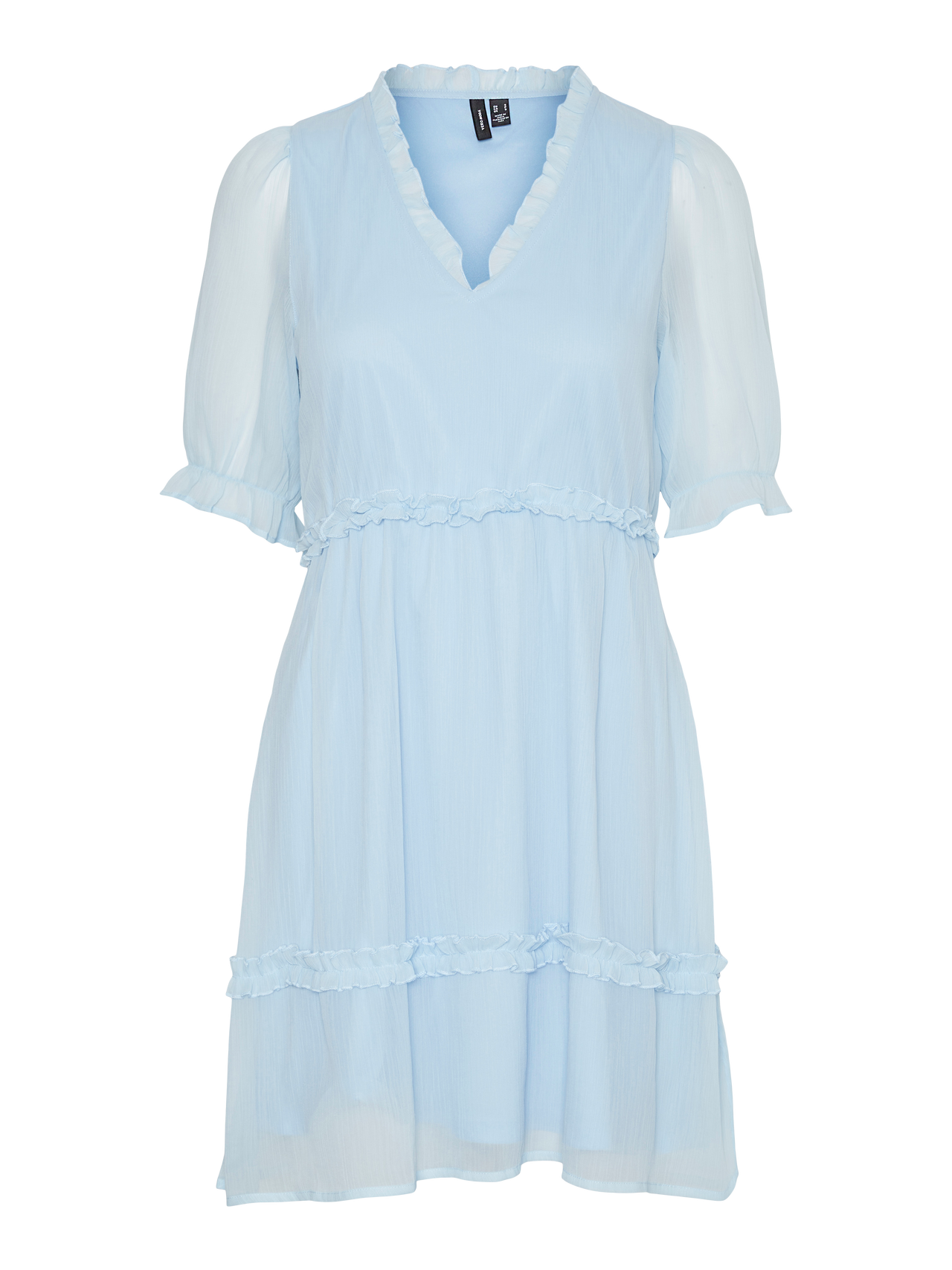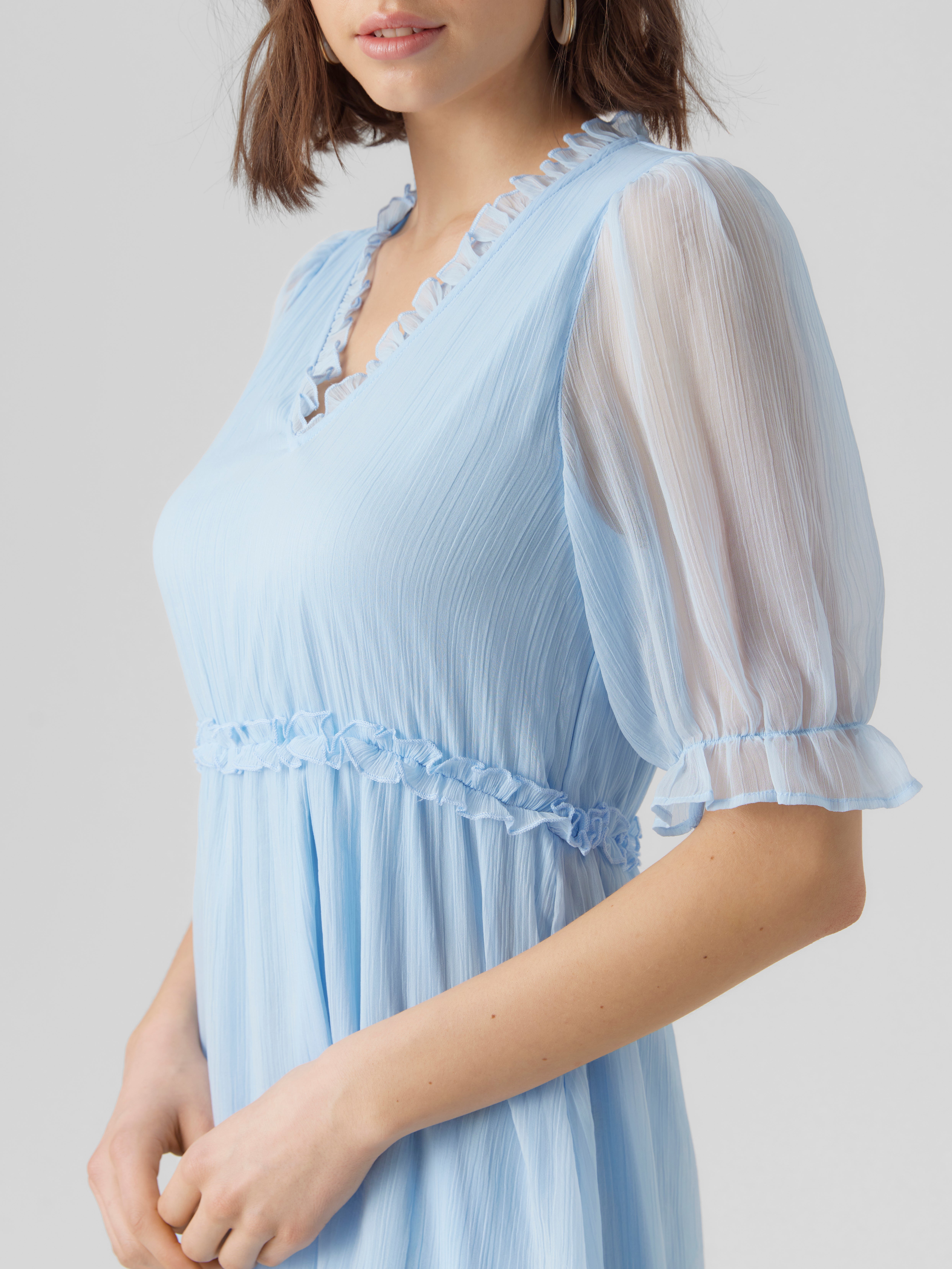 Mini dress with a V-neck, frill details, and sheer sleeves. Style this stunning dress with a pair of heeled boots and some statement jewellery for a stylish look.