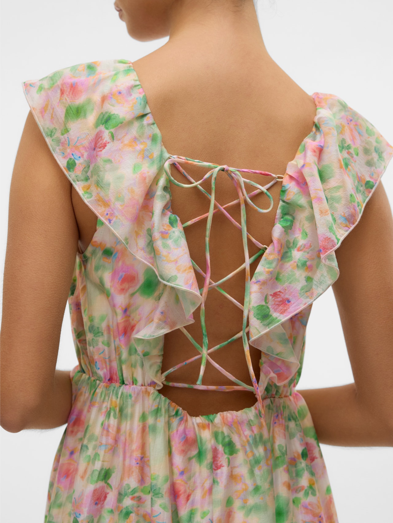 - Extra details : Cutline at waist, Frills, Open back