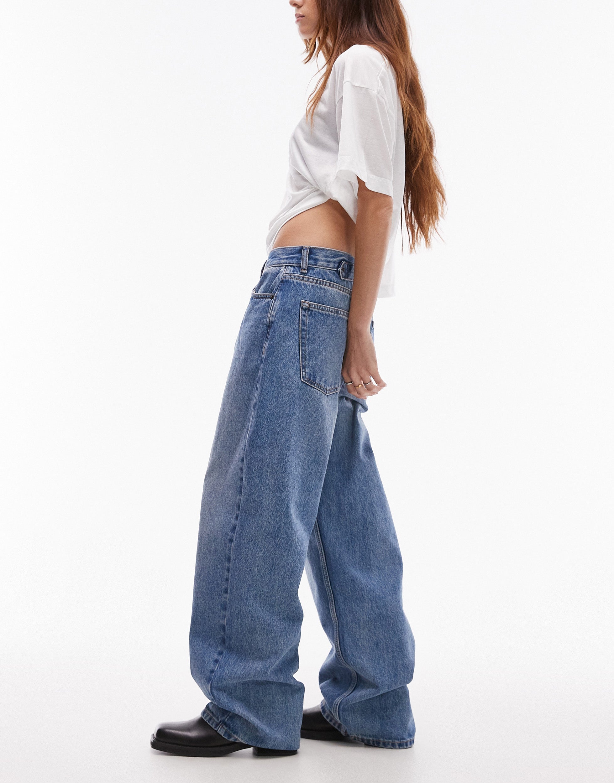 Topshop Cinch low rise relaxed jean in mid blue - MBLUE