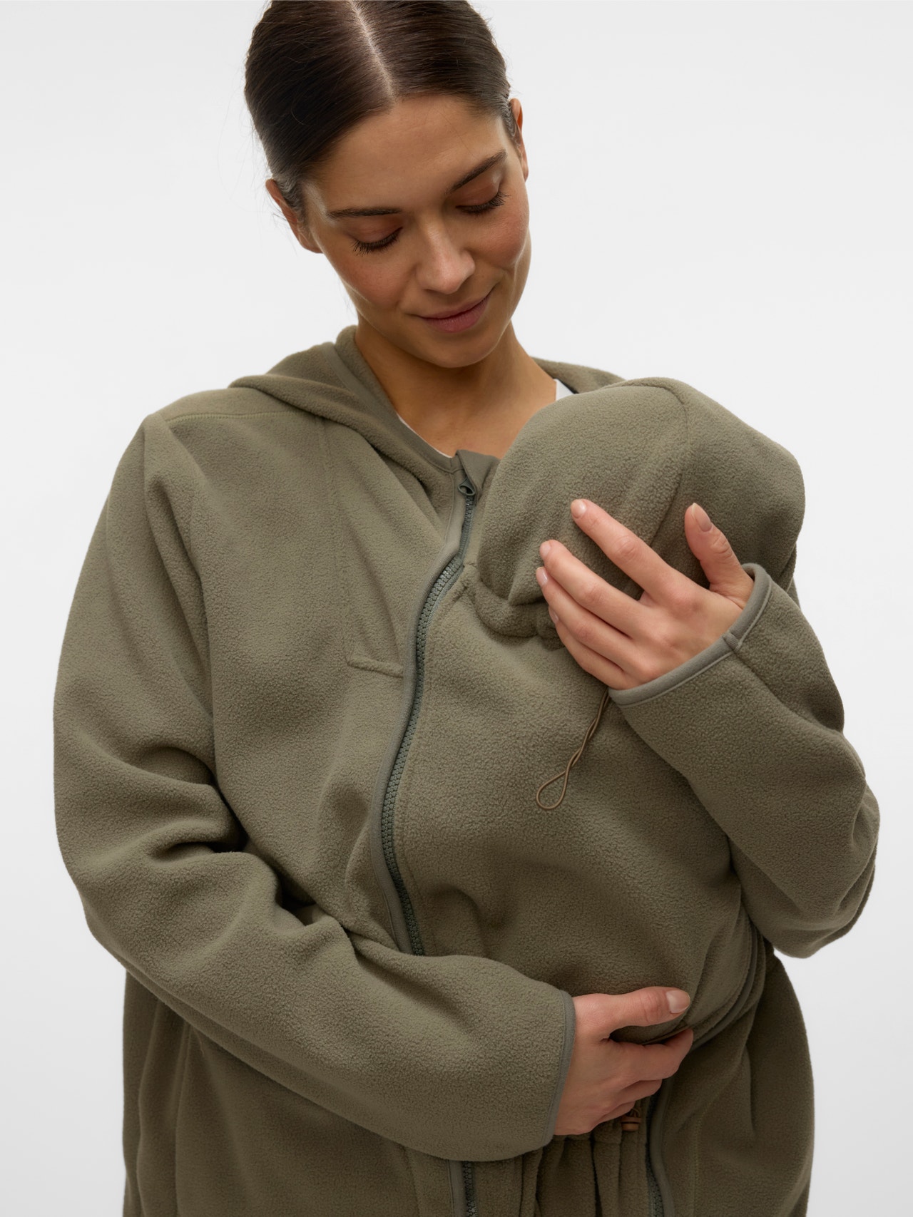 Prepare your wardrobe for a new season with a functional and fashionable 3-in-1outerwear style for pregnancy, post-partum for carrying your child and as a regular jacket. Use it during pregnancy by adding the panel or adjusting the fit; use it post-partum with the practical carry function for your baby; attach the carry panel in front to ensure space for a baby sling, baby carrier, or baby wrap, or wear it as a regular jacket and create a cosy, clean look.