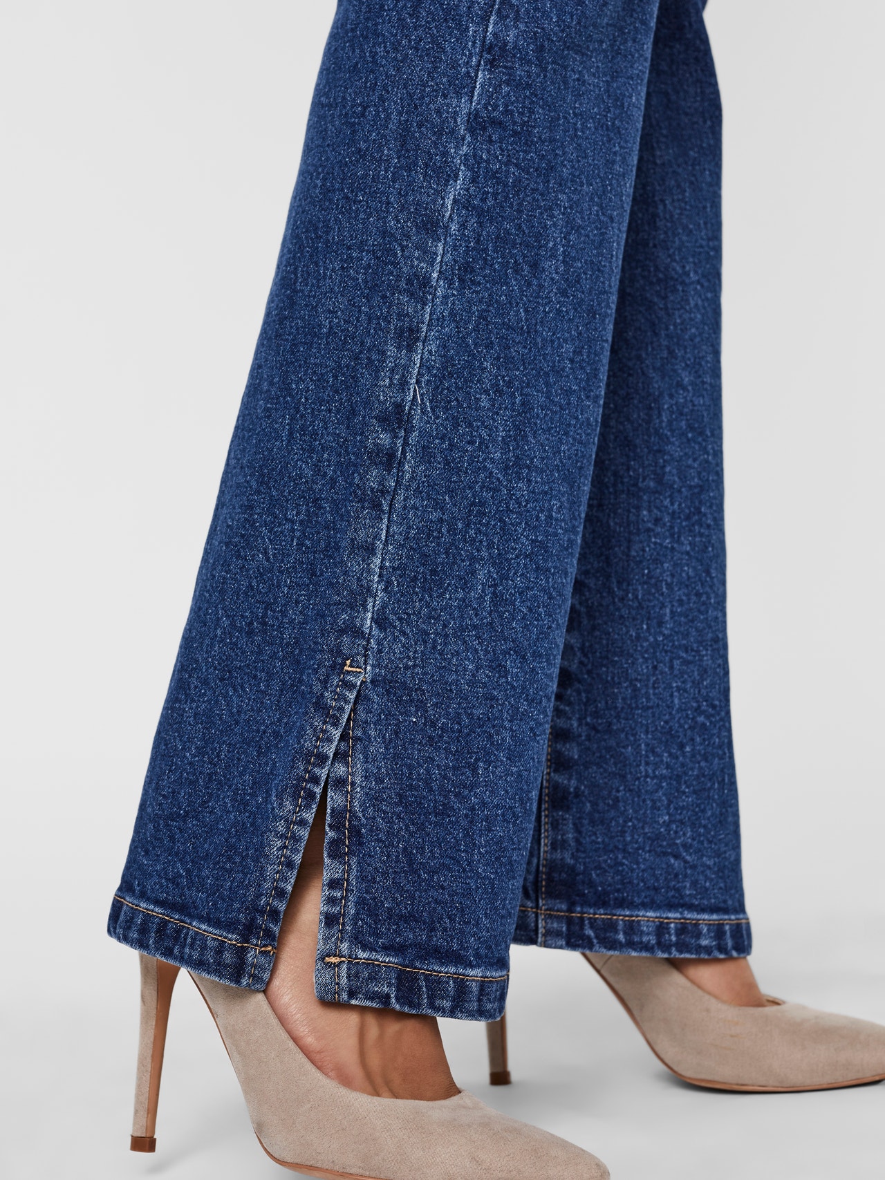 - Flared denim jeans.
