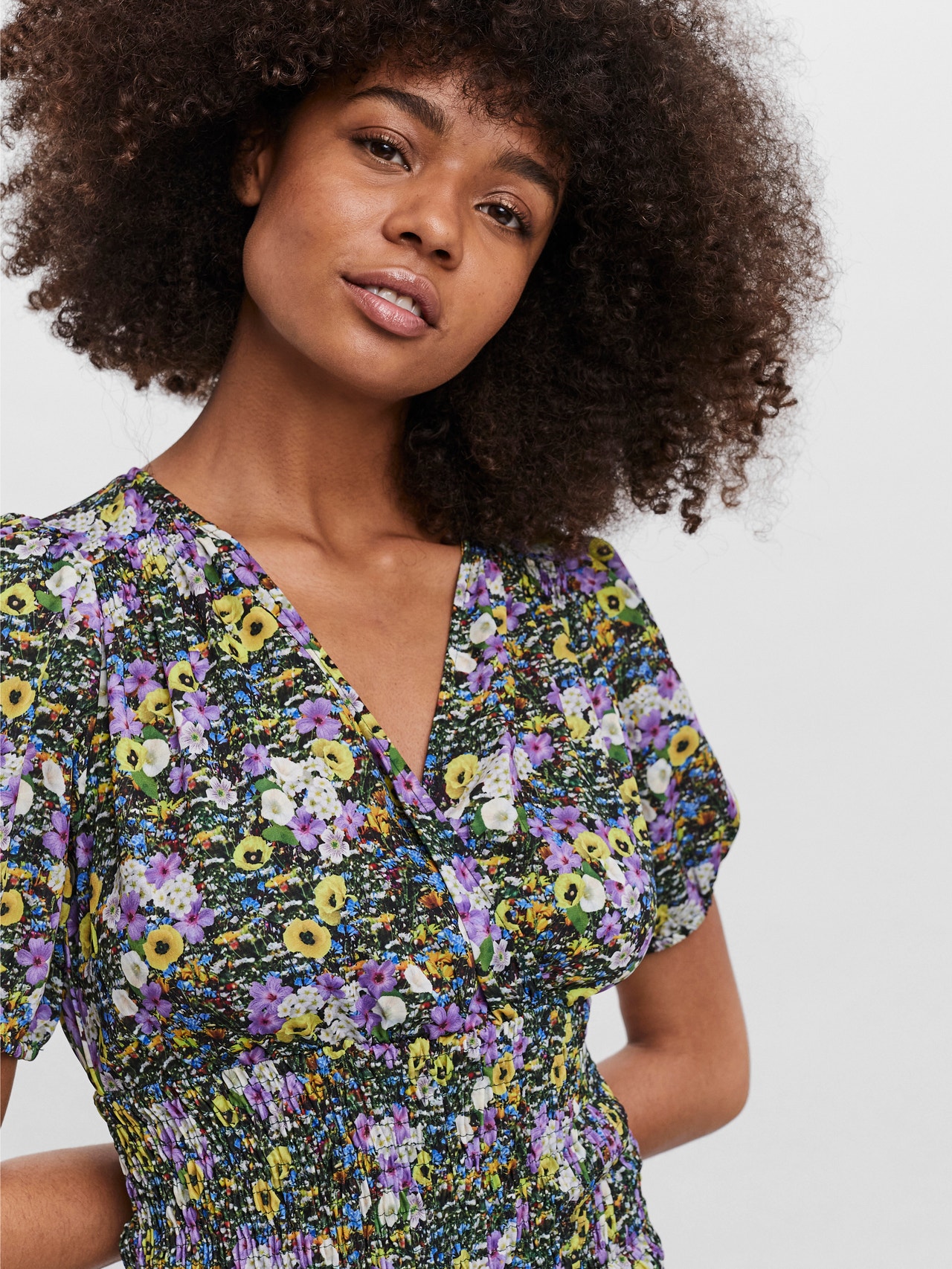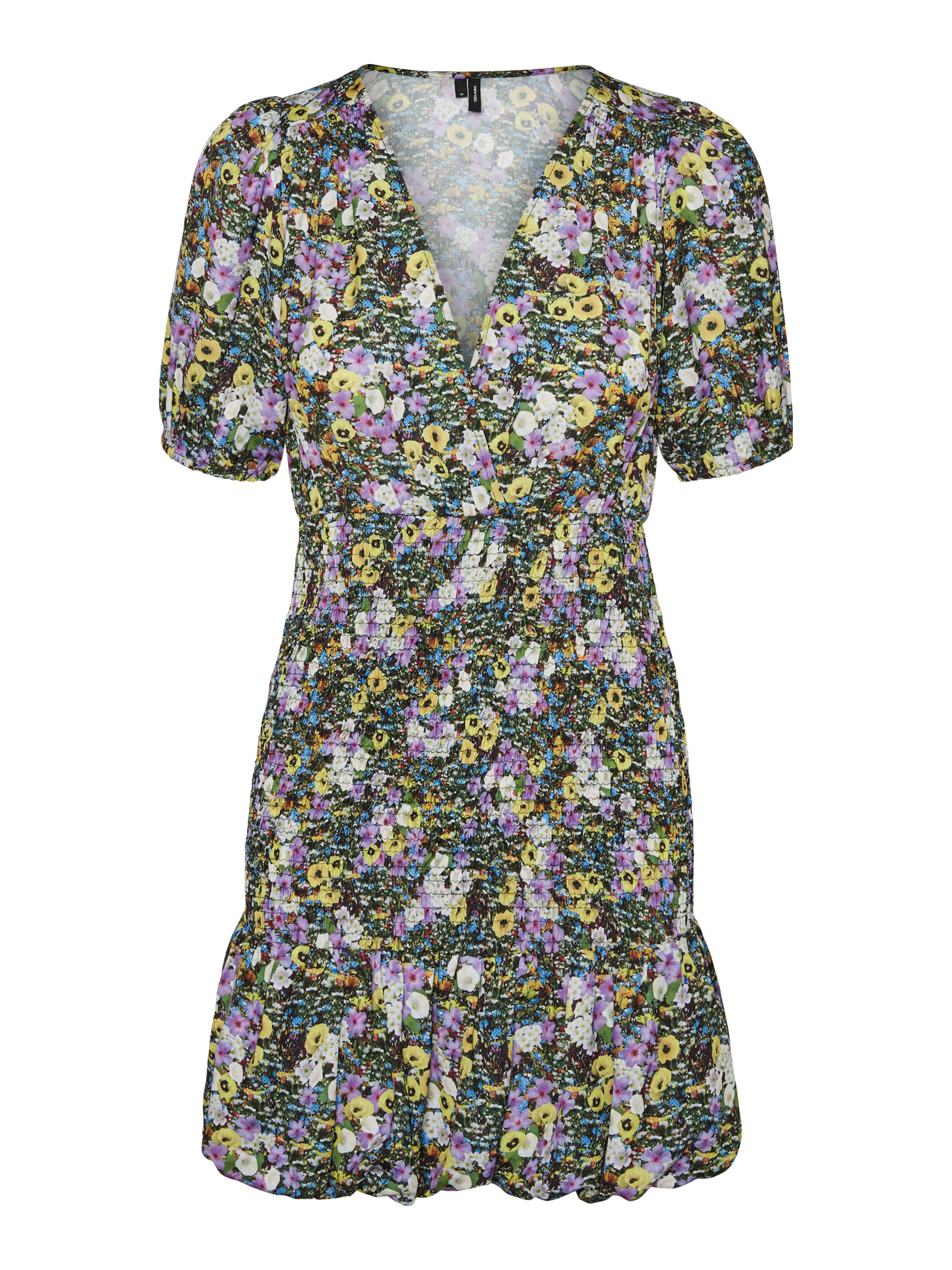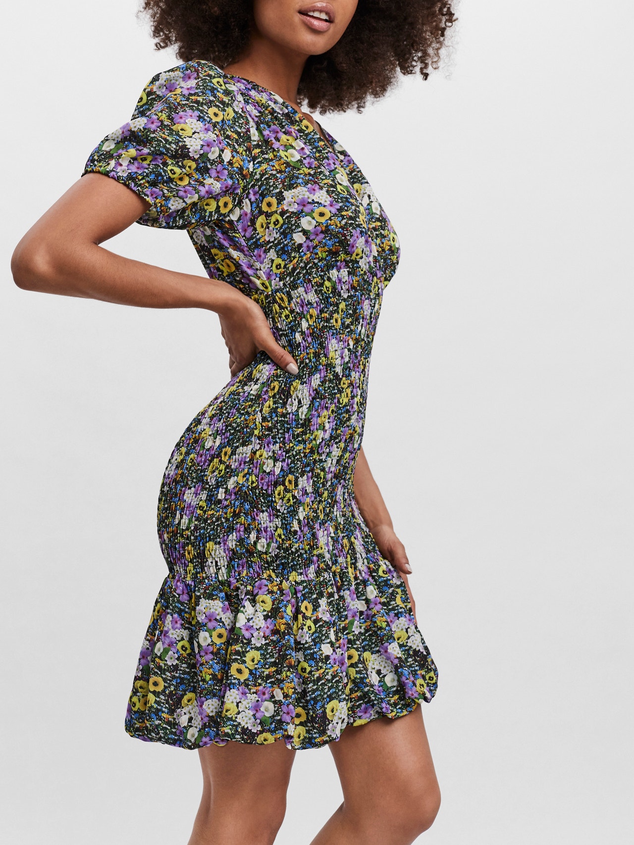 Printed dress with a v-neckline, elastic cuffs, smock skirt, and a bubble bottom hem. Style this stunning dress with some tights, a cool pair of chunky boots, and your best accessories for a great look.