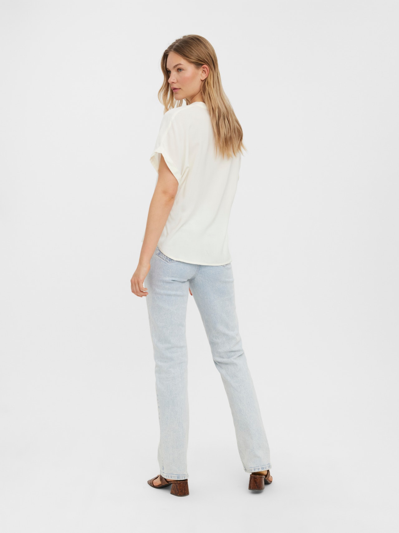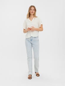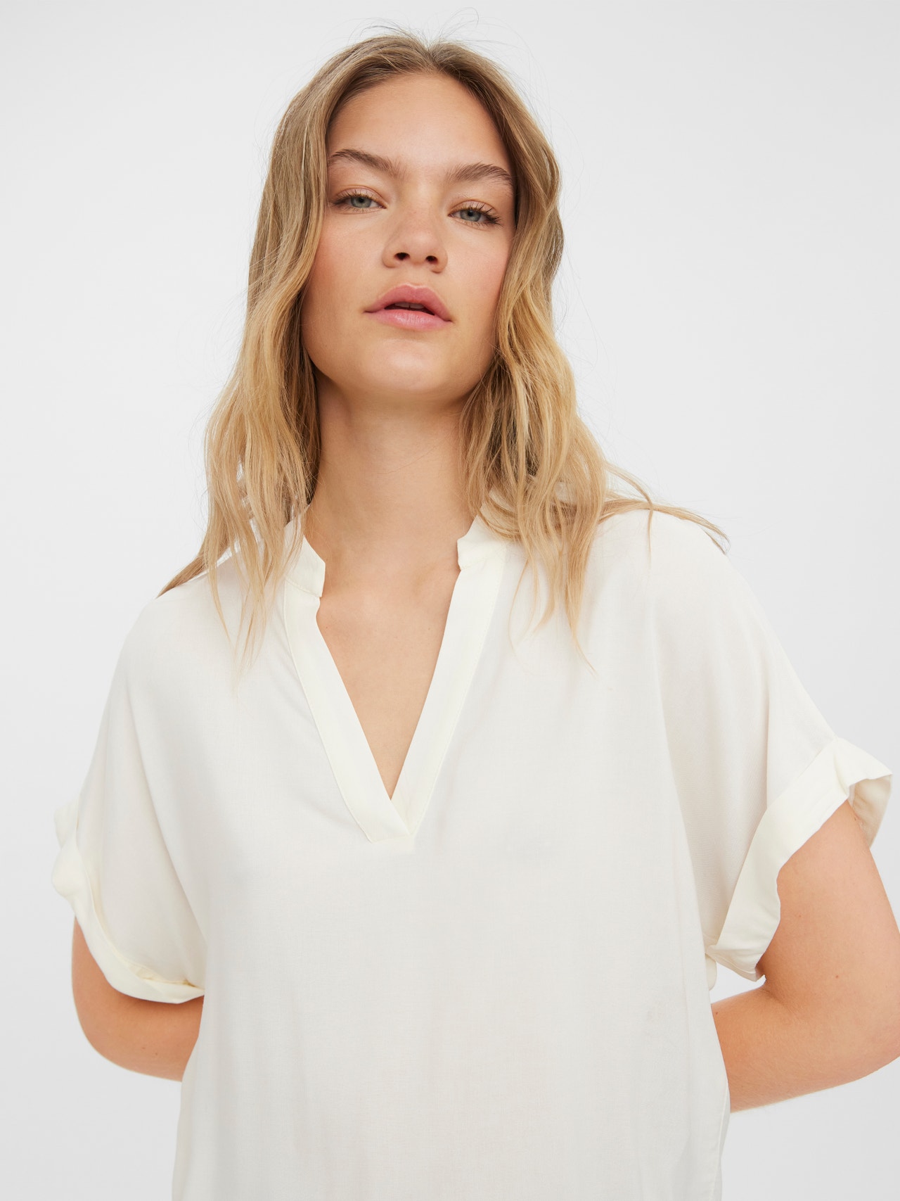 Short-sleeved top with a V-neck and fold-ups at the sleeves. Style this cute top with a skirt and a pair of sandals for a casual everyday look.