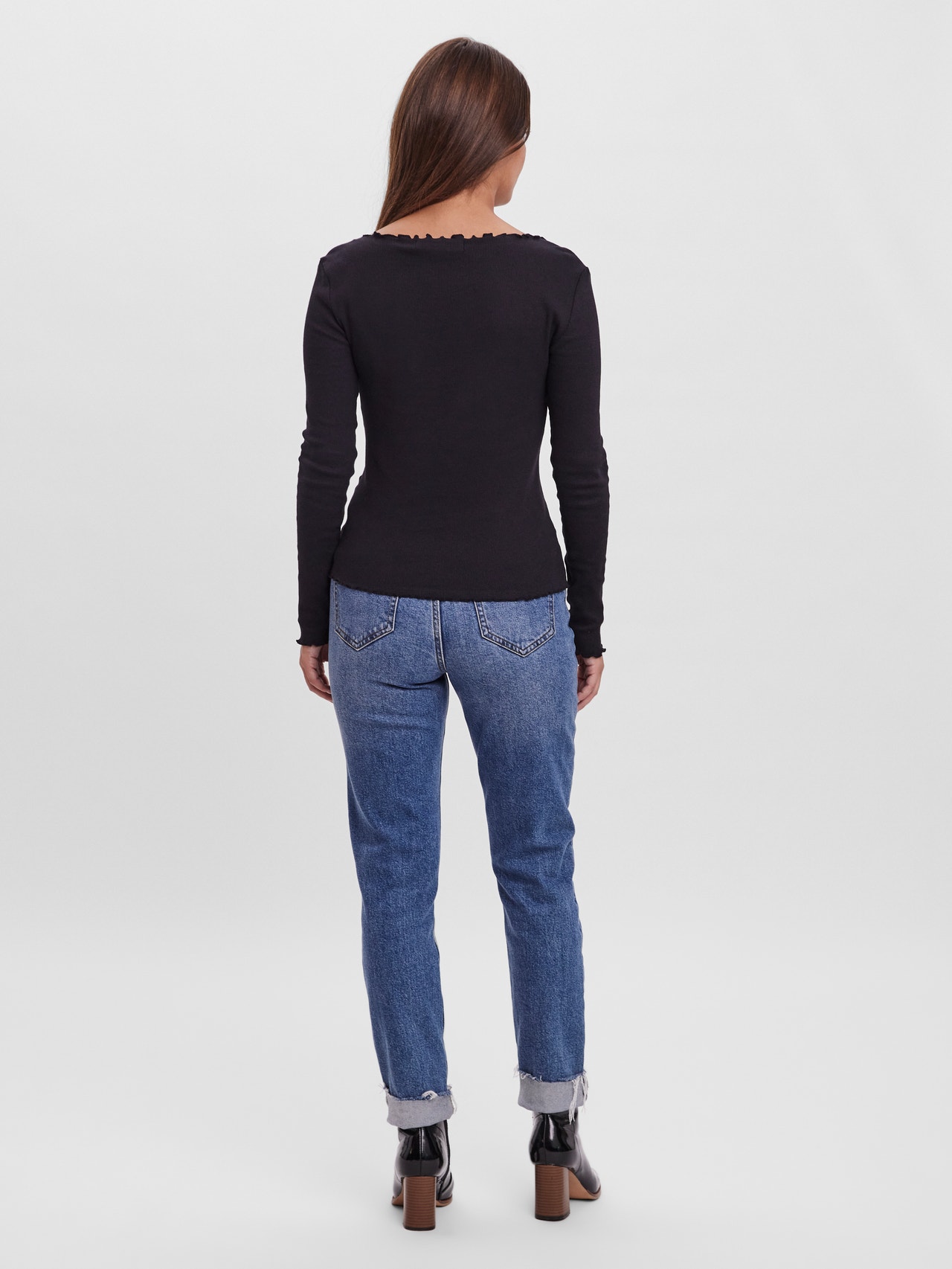 Long-sleeved top with a wide neckline, baby lock details at the neckline, cuffs, and bottom hem. Style this wardrobe staple with your denim favourites and some chunky, laced boots for a stylish everyday look.
