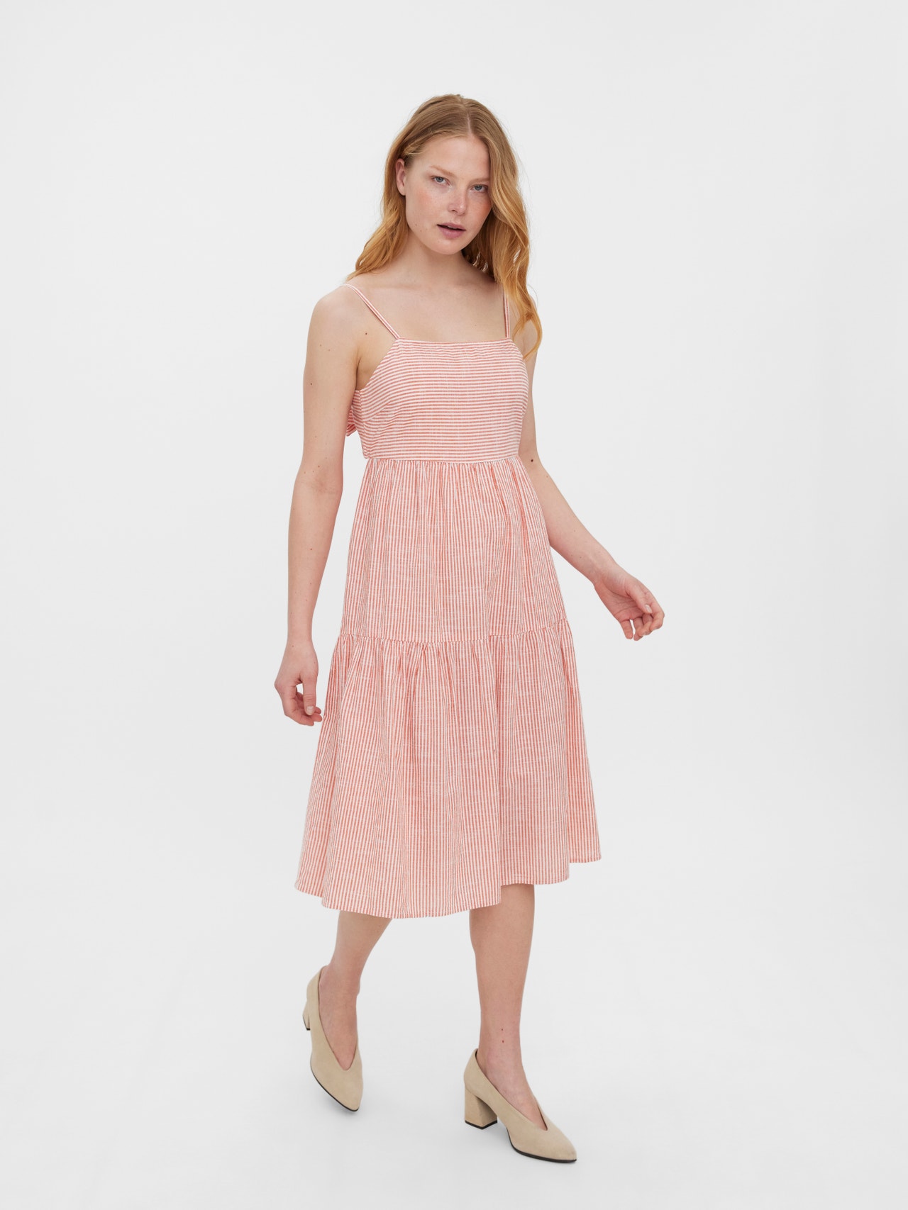Singlet dress with adjustable straps, cutline at the waist, and a square neckline. Style this dress with a pair of sandals and a light jacket for a cute summer look.
