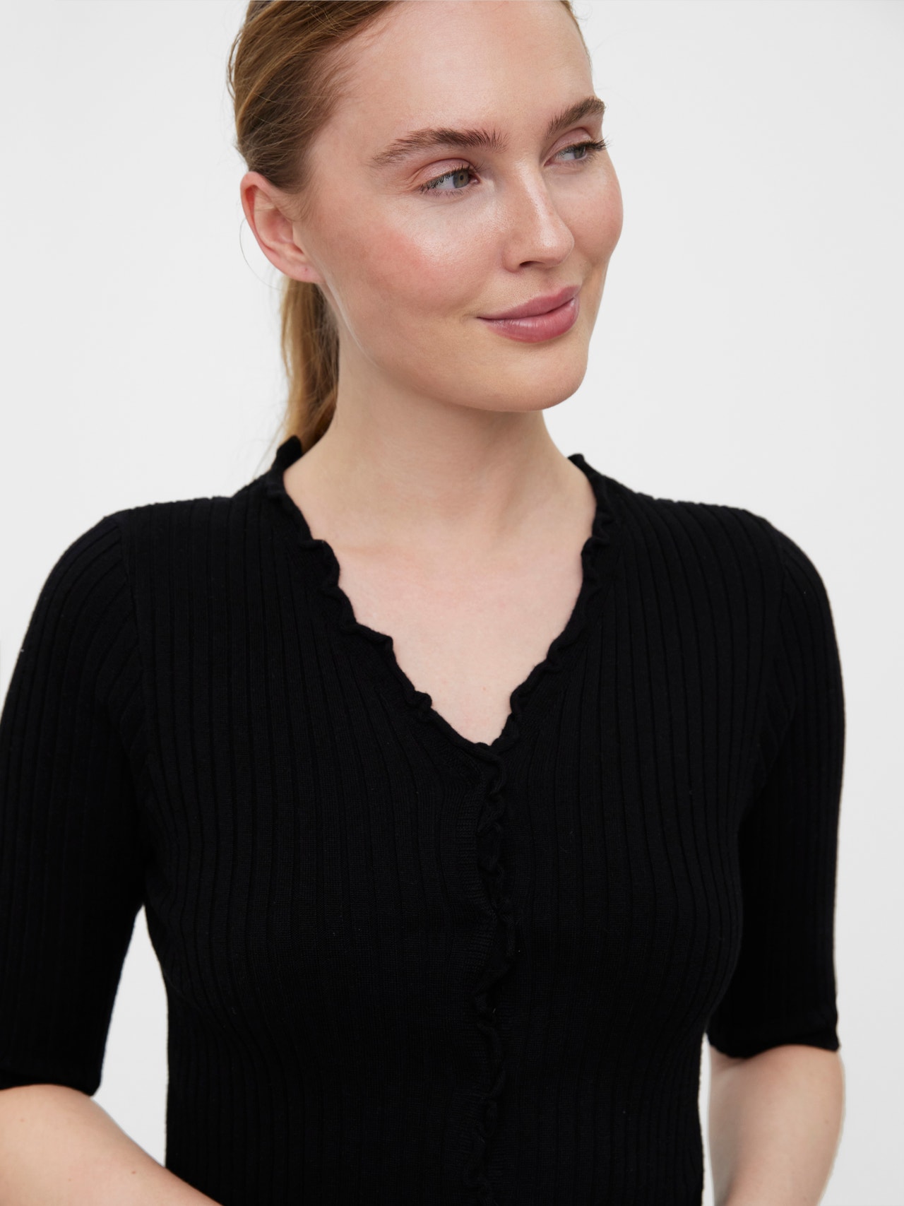 Knitted cardigan with a V-neck, 2/4 sleeves, and a ribbed structure. Style this gorgeous cardigan with a mini skirt and a pair of long boots for a stunning look.