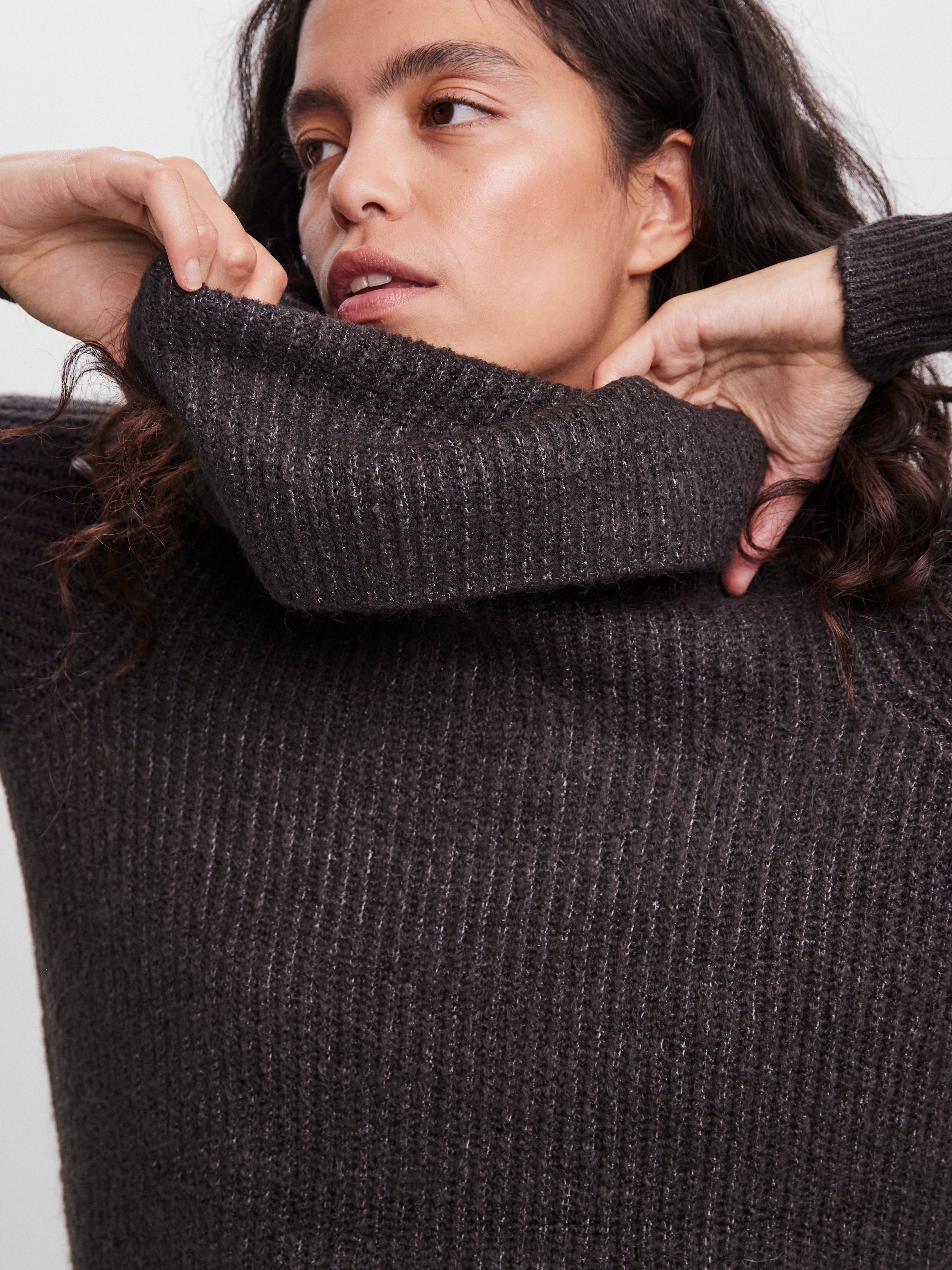 Knitted pullover with a rib structure and a polo neck. Style this knitted pullover with a suede skirt, a pair of tights, and some heeled boots for a stylish and comfy look.