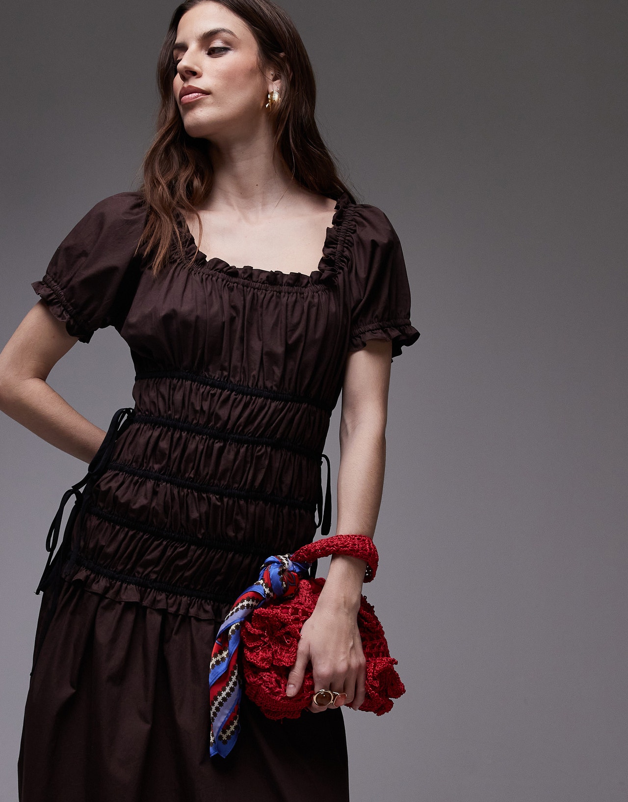 Topshop cap sleeve shirred dress with tie sides in brown with contrast black ties - BRONZE