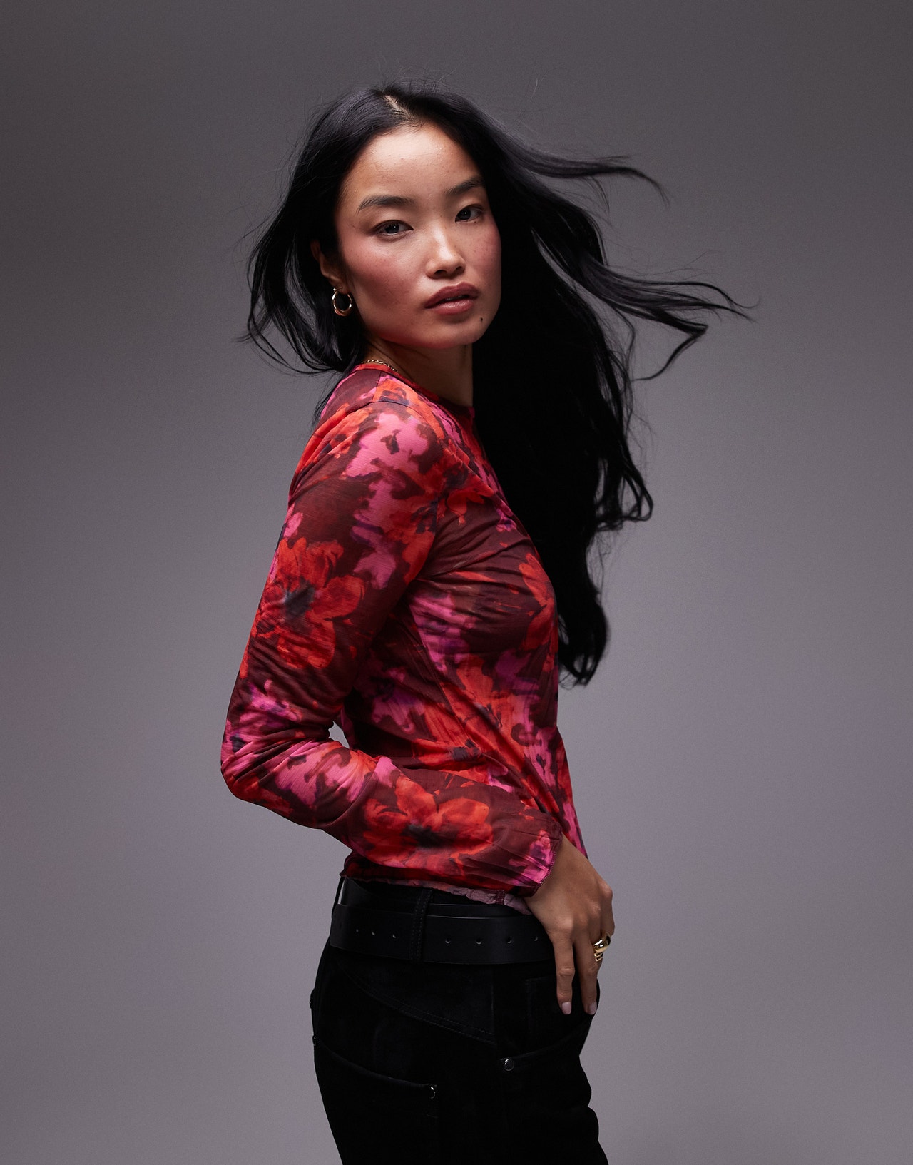 Topshop floral print crinkle mesh long sleeve top in burgundy - RED