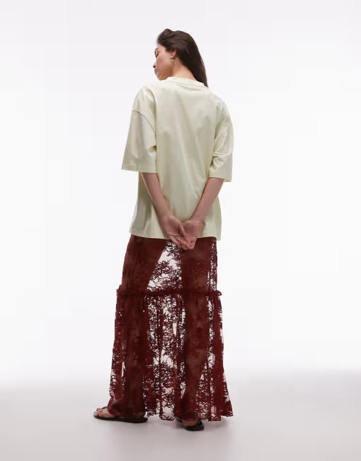 Topshop ruffle seam sheer lace maxi skirt in brown - BROWN