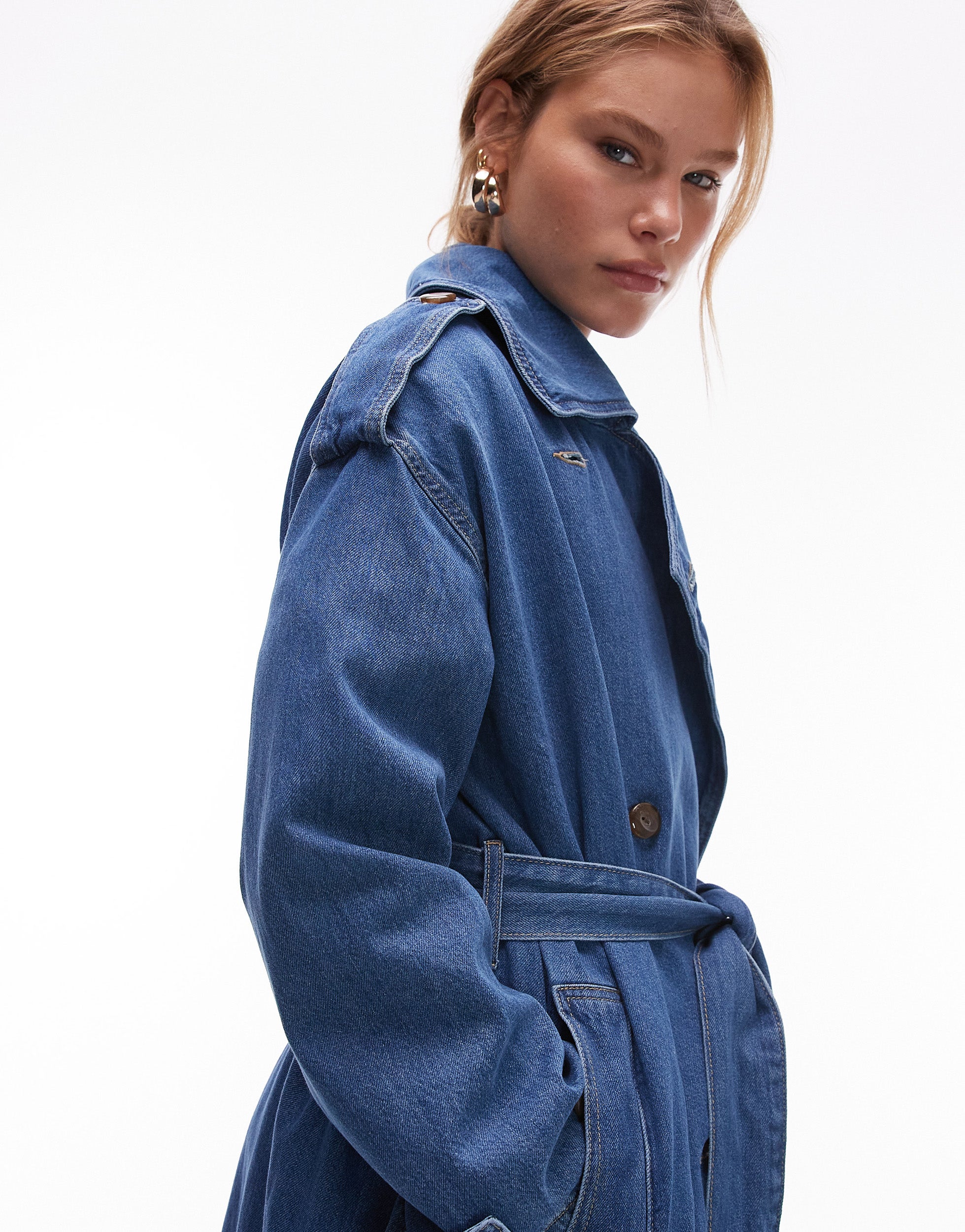 Topshop denim trench coat in mid blue - MBLUE