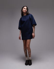 Topshop denim mini shift dress with balloon sleeves in raw look indigo - MBLUE