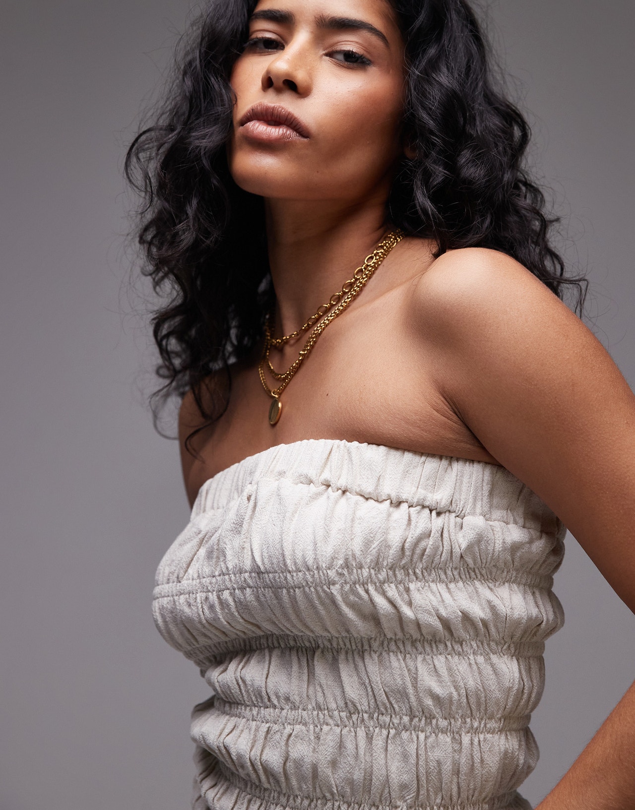 Topshop shirred linen bandeau in natural - BEIGE