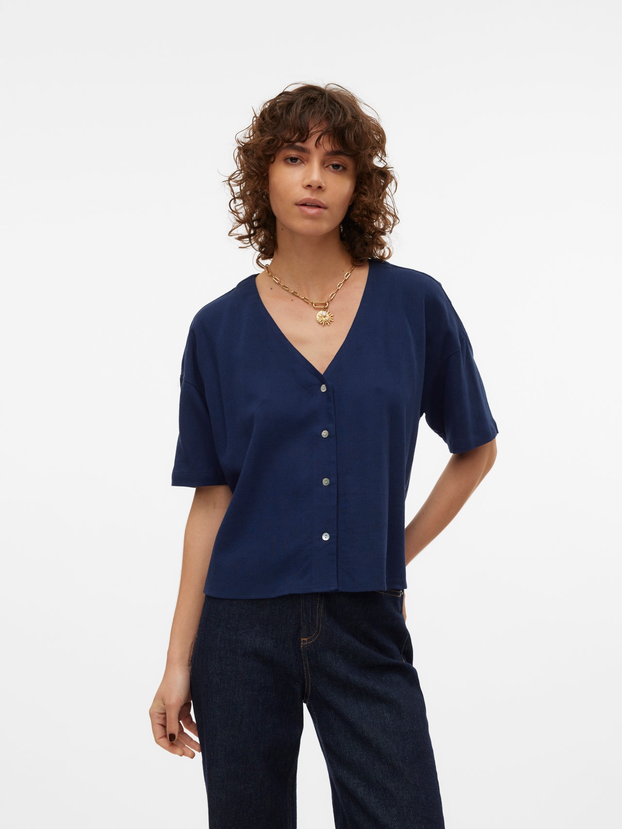 Denne skjorten er et elegant og allsidig tillegg til garderoben, ettersom den kan brukes alene eller åpen med en topp under. Kombiner med klassiske jeans og en ensfarget T-skjorte for en kul hverdagslook, eller kle den opp ved å legg til en bukse og et par høye hæler.