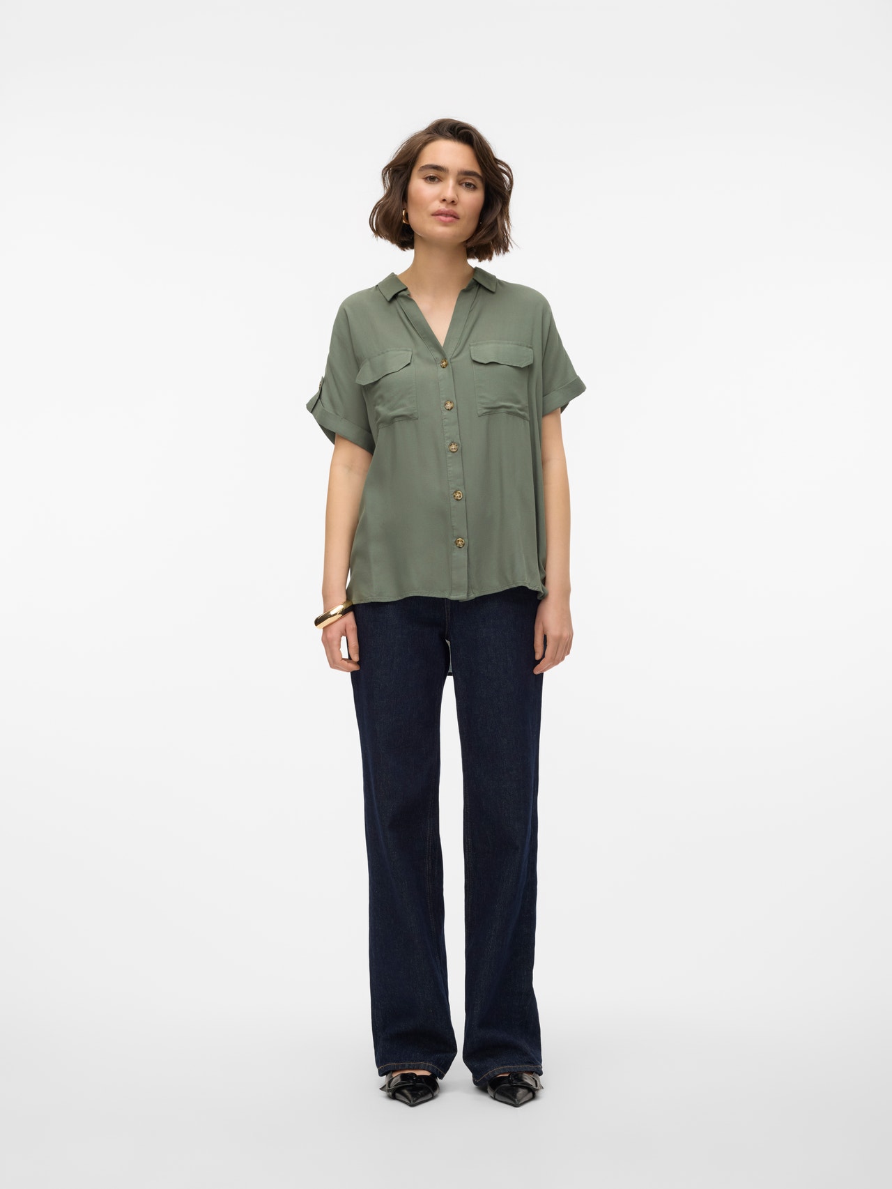 Denne skjorten er et elegant og allsidig tillegg til garderoben, ettersom den kan brukes alene eller åpen med en topp under. Kombiner med klassiske jeans og en ensfarget T-skjorte for en kul hverdagslook, eller kle den opp ved å legg til en bukse og et par høye hæler.