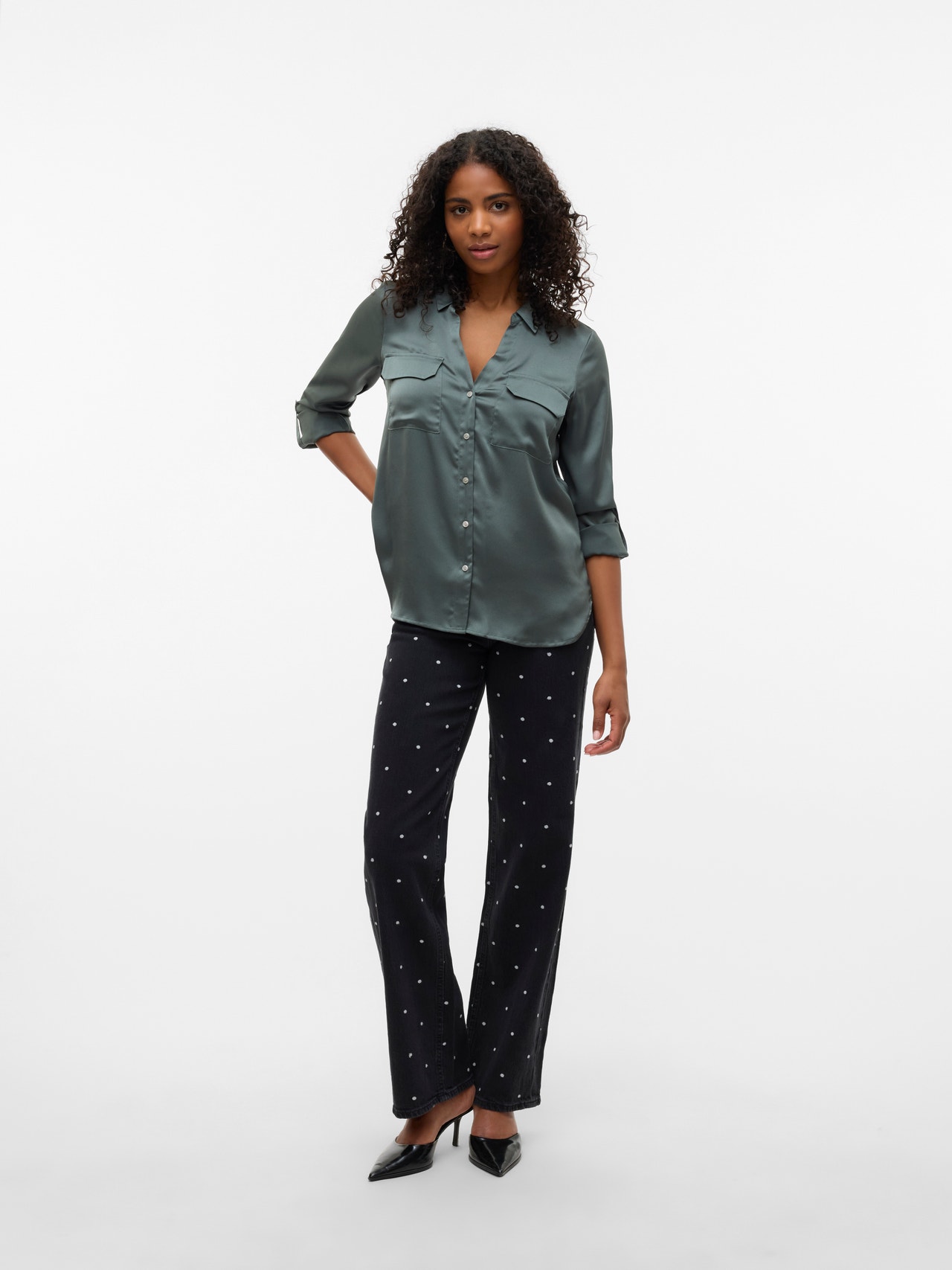 Denne skjorten er et elegant og allsidig tillegg til garderoben, ettersom den kan brukes alene eller åpen med en topp under. Kombiner med klassiske jeans og en ensfarget T-skjorte for en kul hverdagslook, eller kle den opp ved å legg til en bukse og et par høye hæler.
