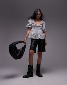 Topshop poplin puff sleeve top in mono stripe - BLACK