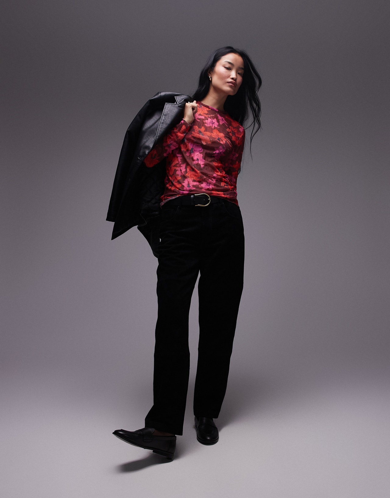 Topshop floral print crinkle mesh long sleeve top in burgundy - RED