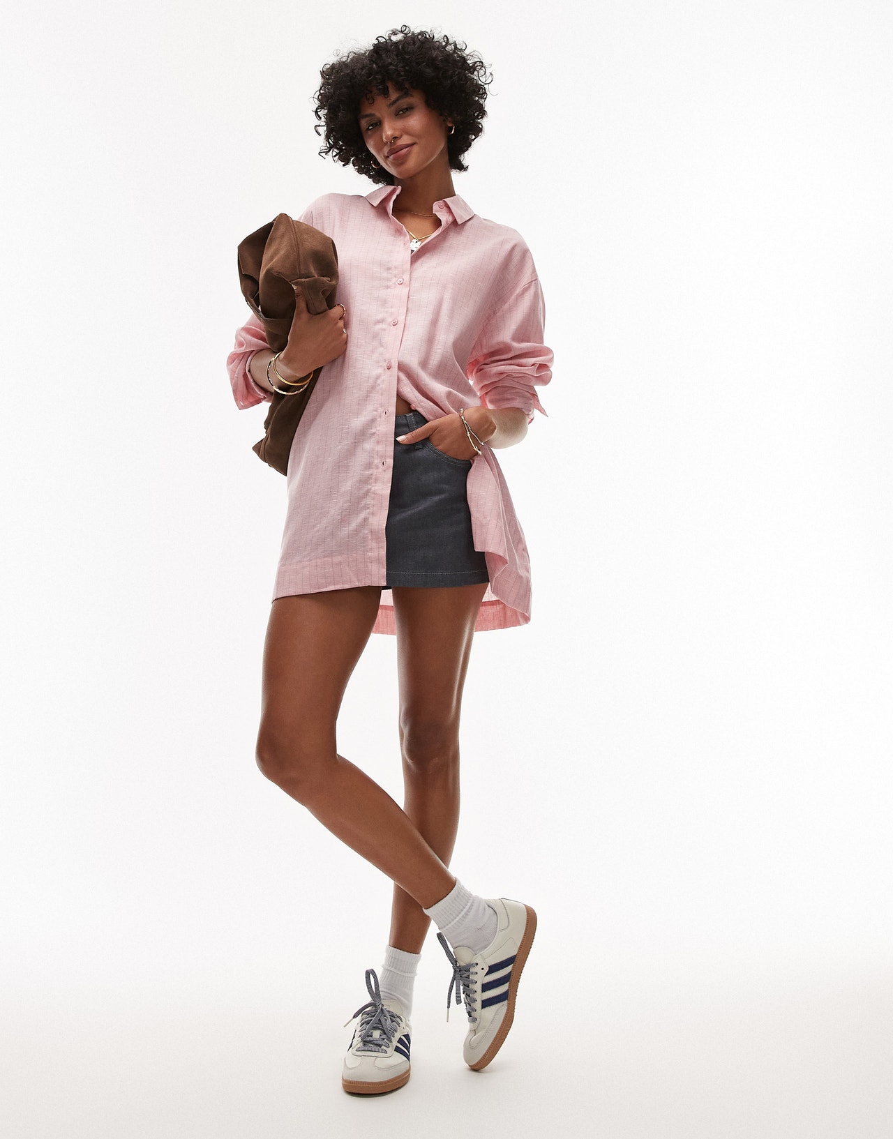 Topshop linen look shirt in pink with blue pinstripe - PINK