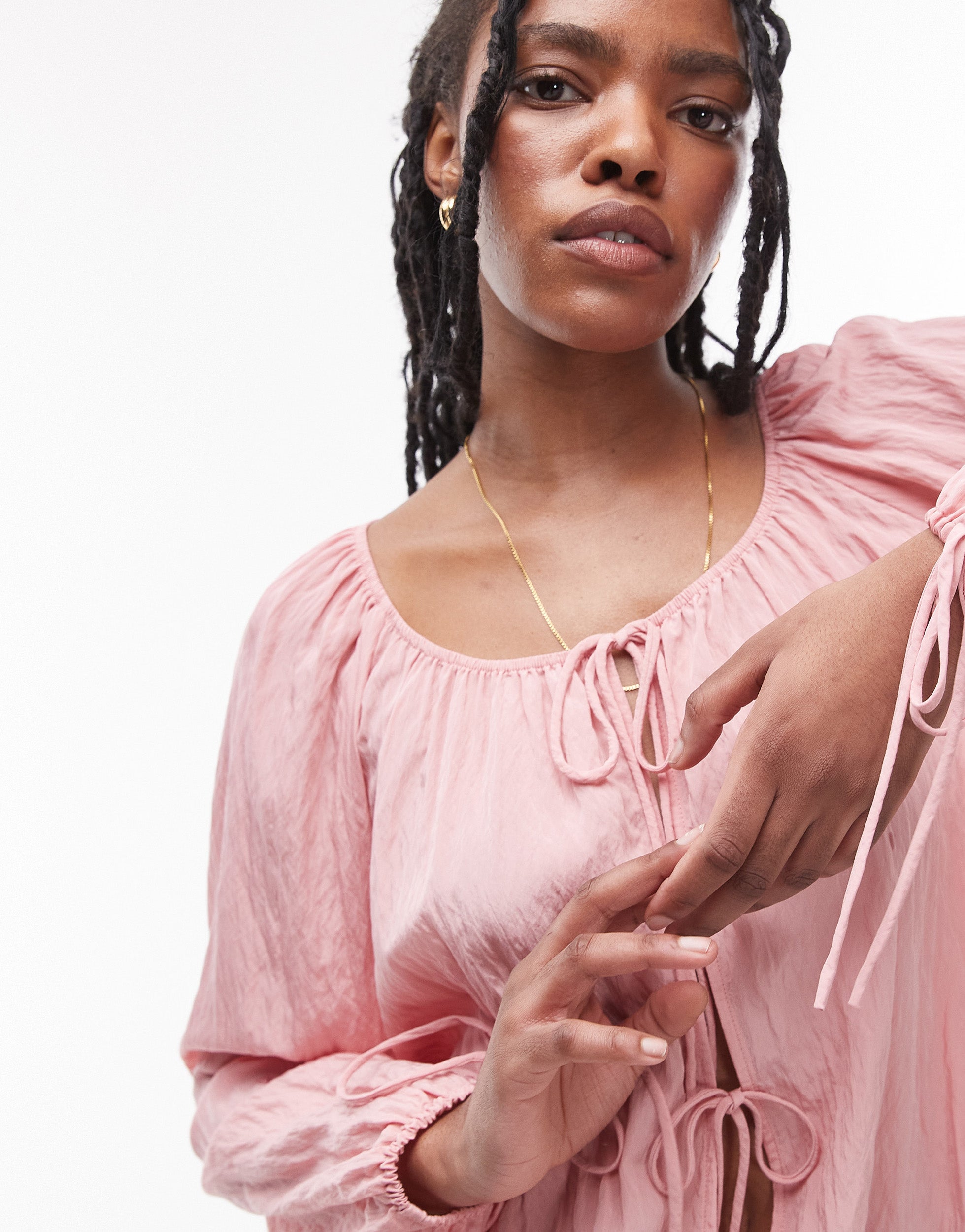 Topshop ruched neck tie front top in pink
