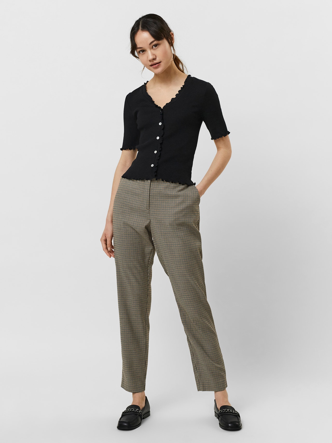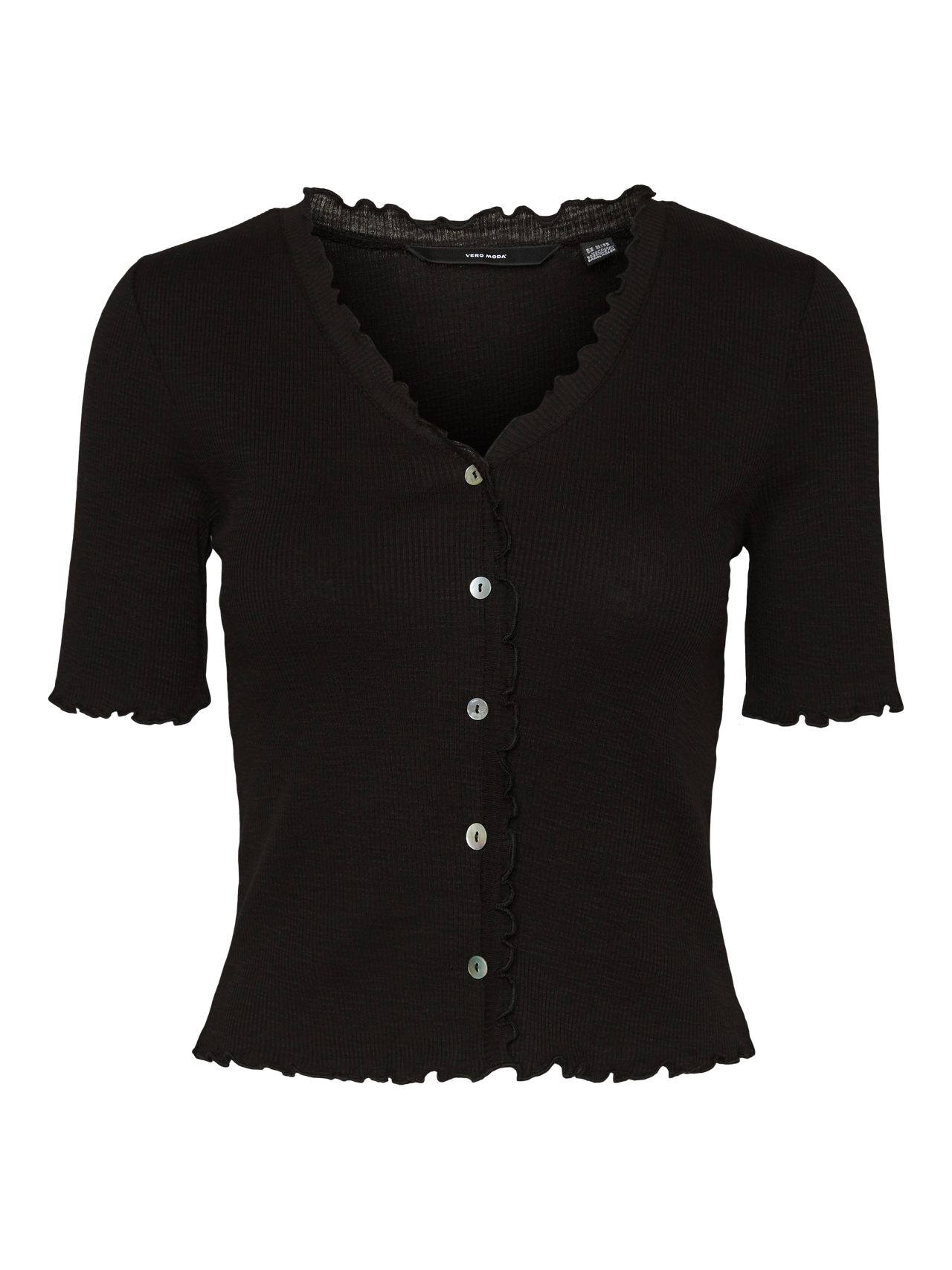 Short sleeved cardigan with fake buttons in the front, frills by the neckline, sleeve- and bottom hem, and a v-neckline. Style this cute cardigan with some high-waisted trousers and a cool pair of heeled sandals for a chic and beautiful everyday look.