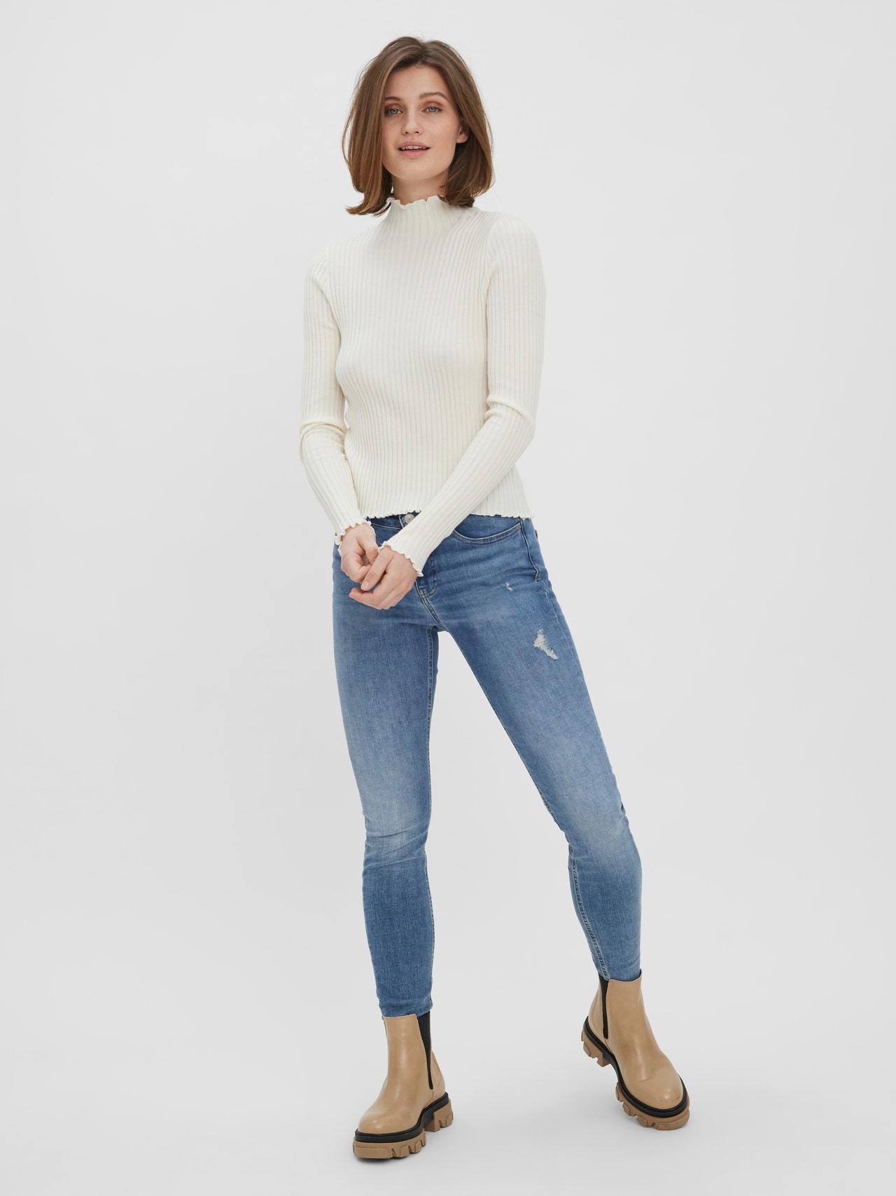 Long-sleeved pullover with a high neck, ribbed structure, and babylock at the neckline, cuffs, and bottom hem. Style this cute pullover with a skirt and a pair of long boots for a cool look.