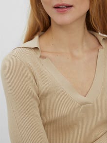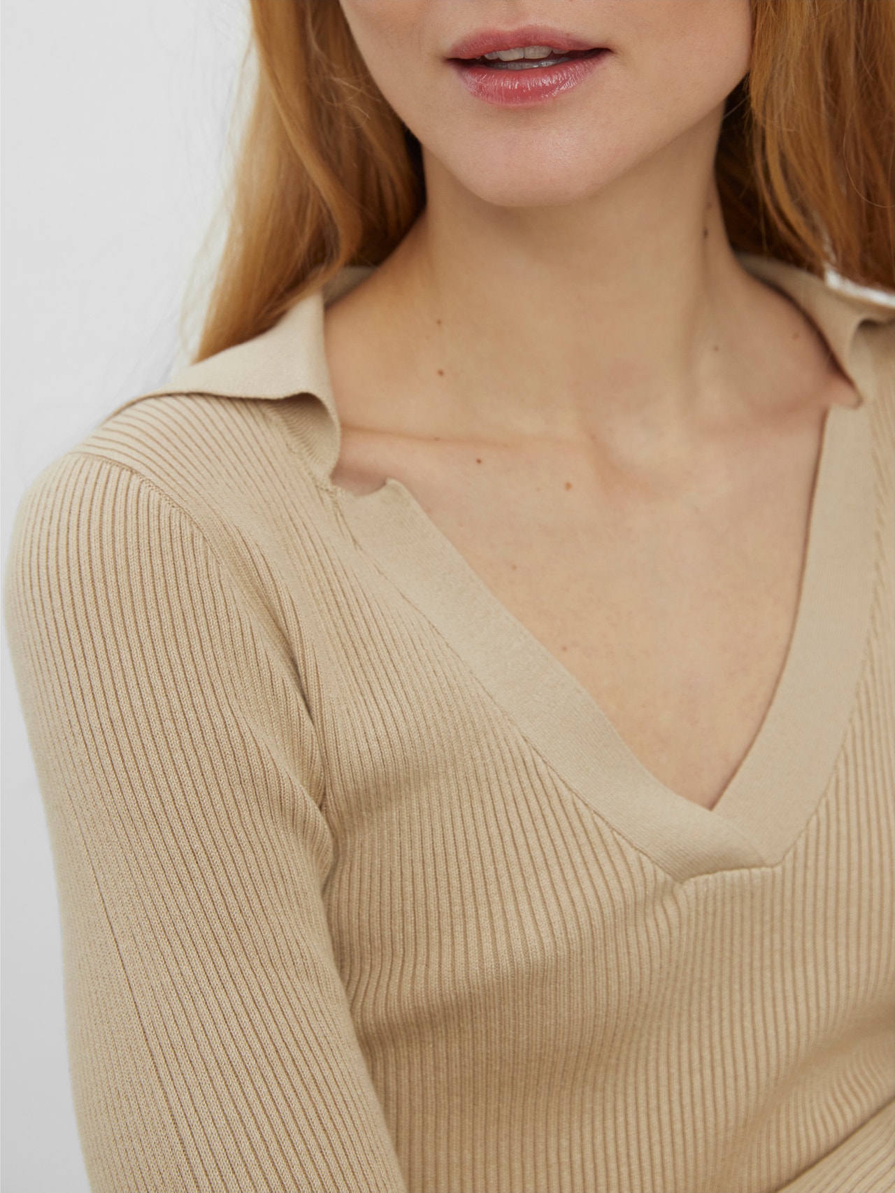 Knitted pullover with a V-neck, polo collar, and a ribbed structure. Style this gorgeous pullover with a mini skirt and a pair of loafers for a stylish, effortless look.